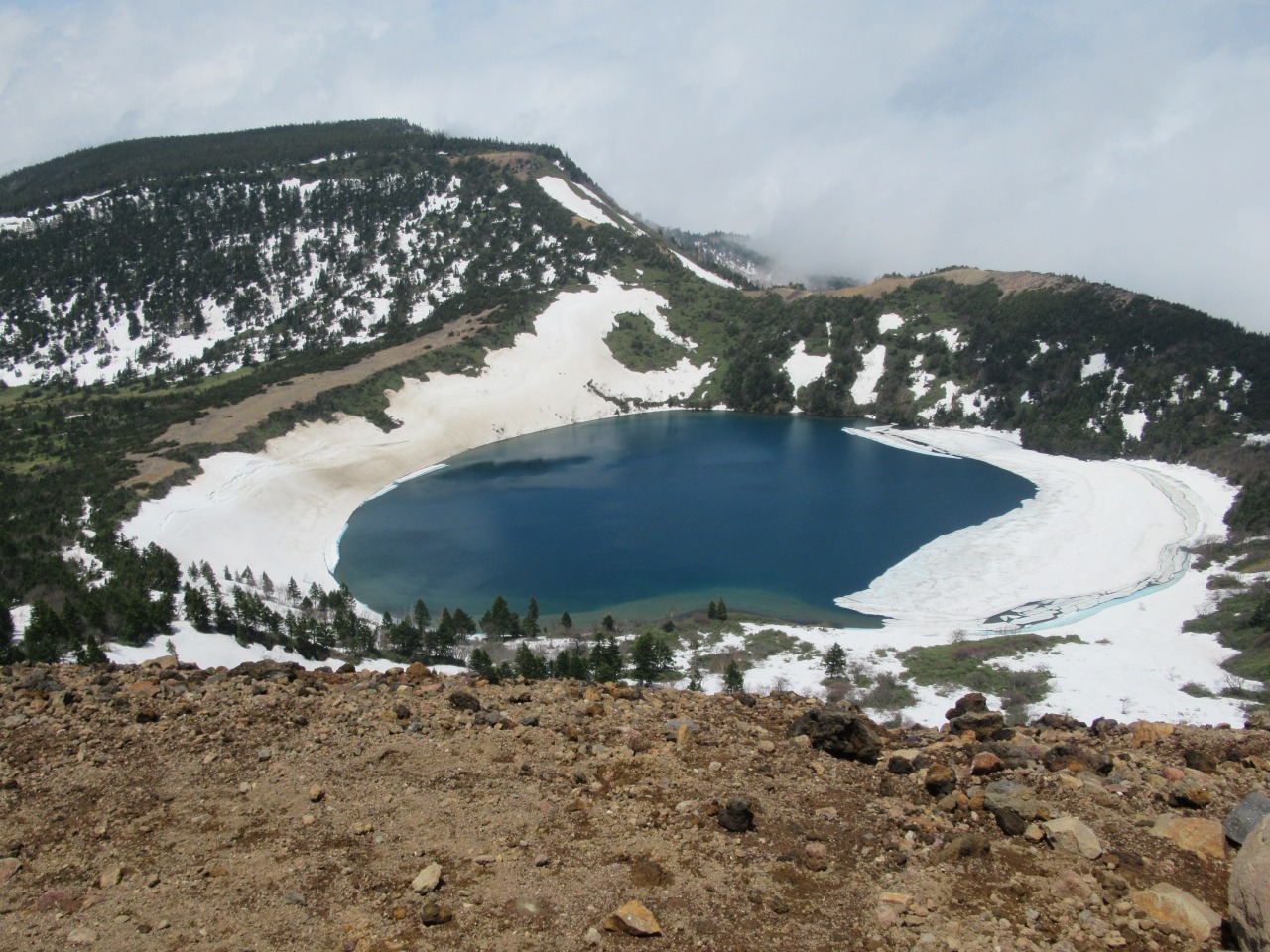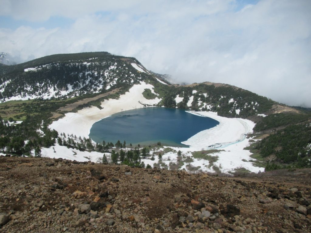 楽しみにしていた魔女の瞳とのご対面、氷は8割方融けコバルトブルーの湖面が見え、完全に覚醒、雲が切れると陽が射し紺碧の瞳が際立ちます。ガスで西吾妻山より奥の遠景は望めませんが、平日で空いている広い山頂で五色沼(魔女の瞳)を何度も眺め、たっぷり1時間の大休止です。