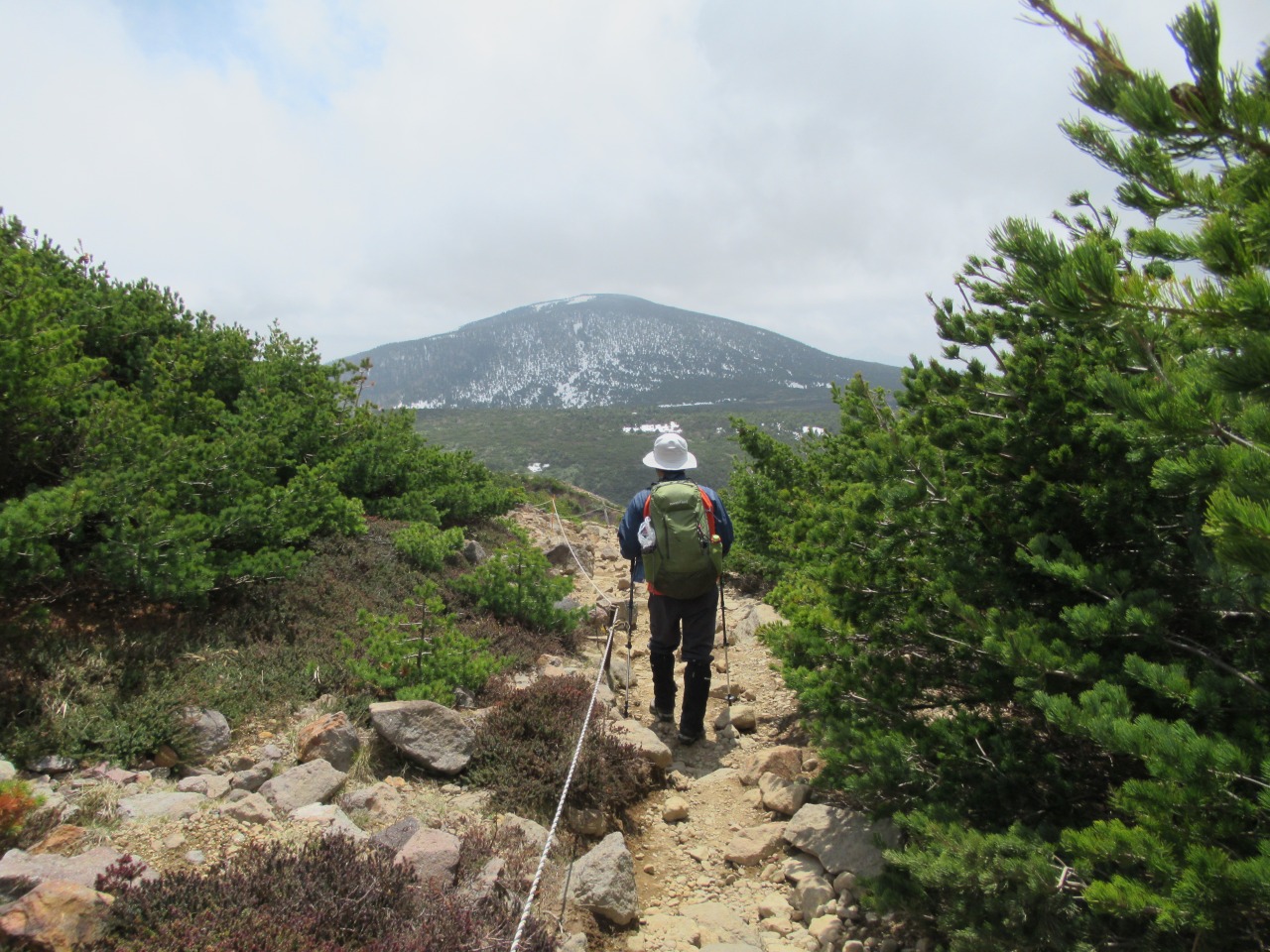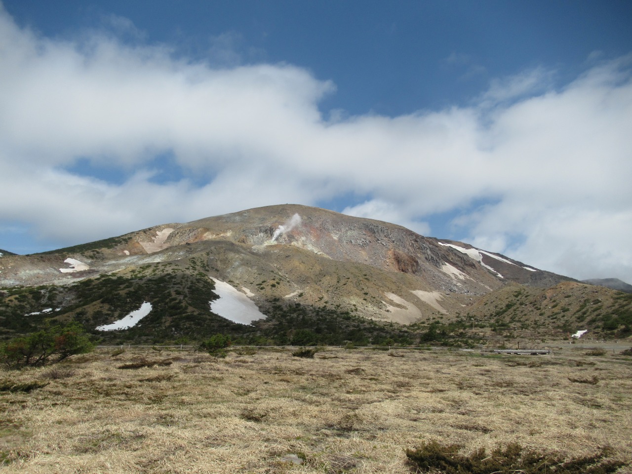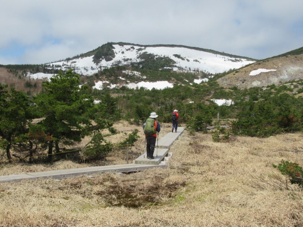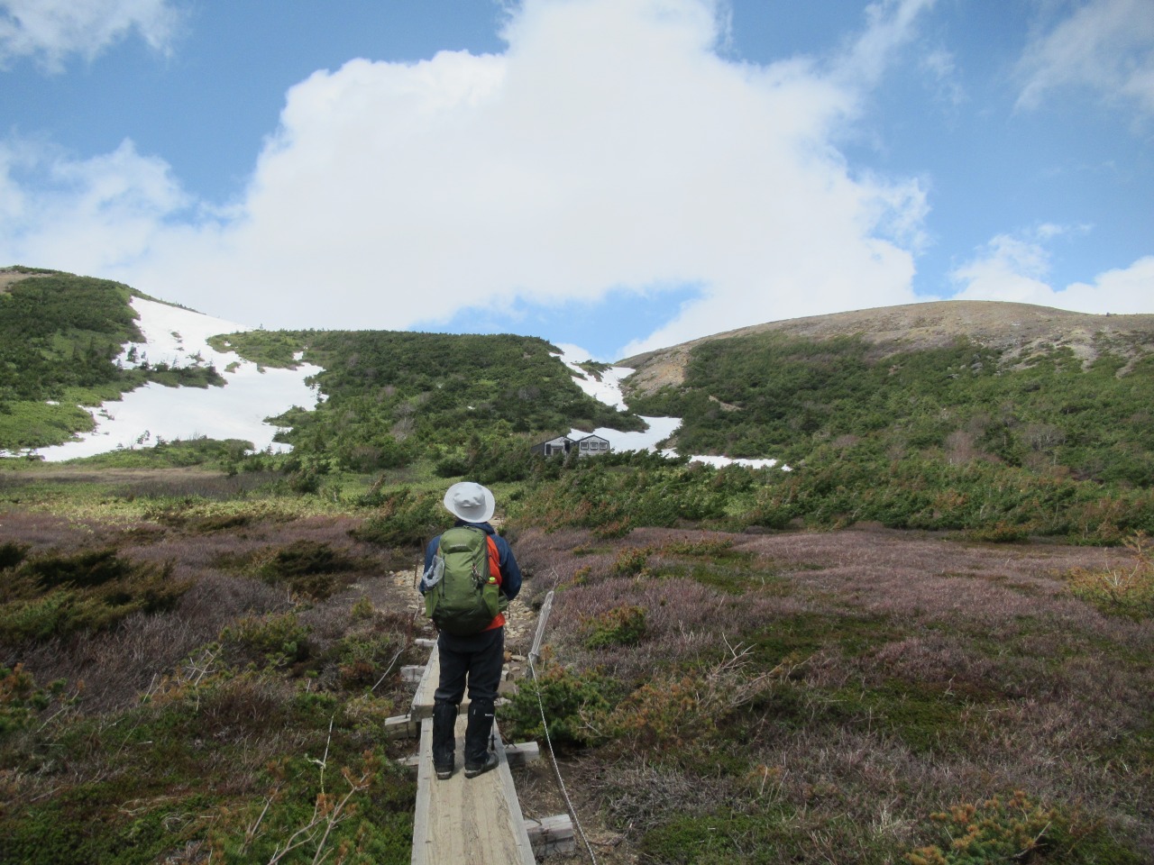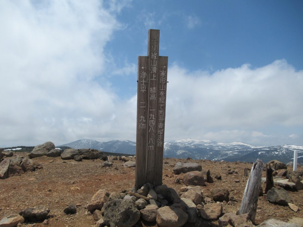 早朝はガスも出ていた様ですが、10時前に浄土平に着くと予報通り雲も取れ始めました。2週間前より可成り雪融けは進みましたが、酸ケ平手前は雪渓が残っています。それでも山頂に至る登山道傍らにはガンコウランのピンクの花が咲き、春は進んでいます。稜線に出ると風が出て、右手に吾妻小富士の火口を見下ろしながら、荒涼とした緩傾斜の火山岩の登山道を進めば一切経山々頂です。