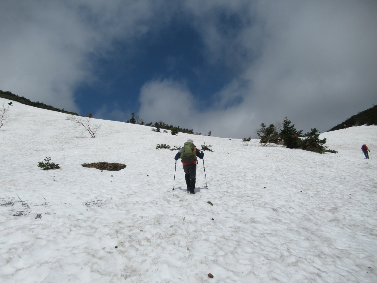 鎌沼から浄土平に至る道には雪が残り、所々登山道を外れたトレース、沢が至る所に走りルートが分不明確、久し振りにGPS、コンパス、地形図のお世話になりました。