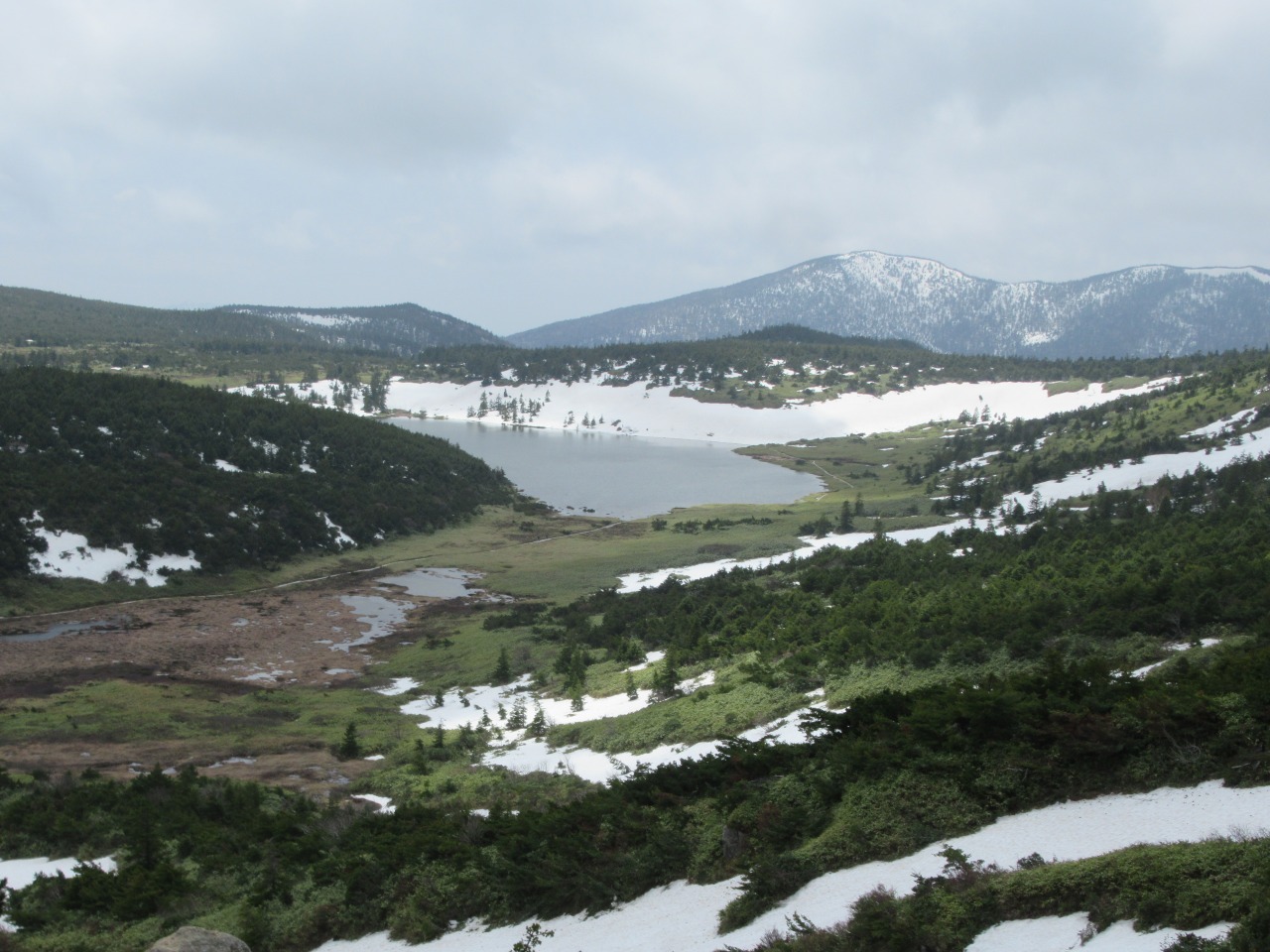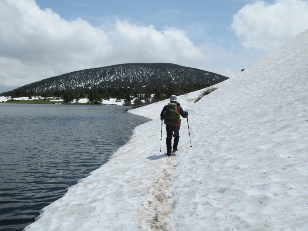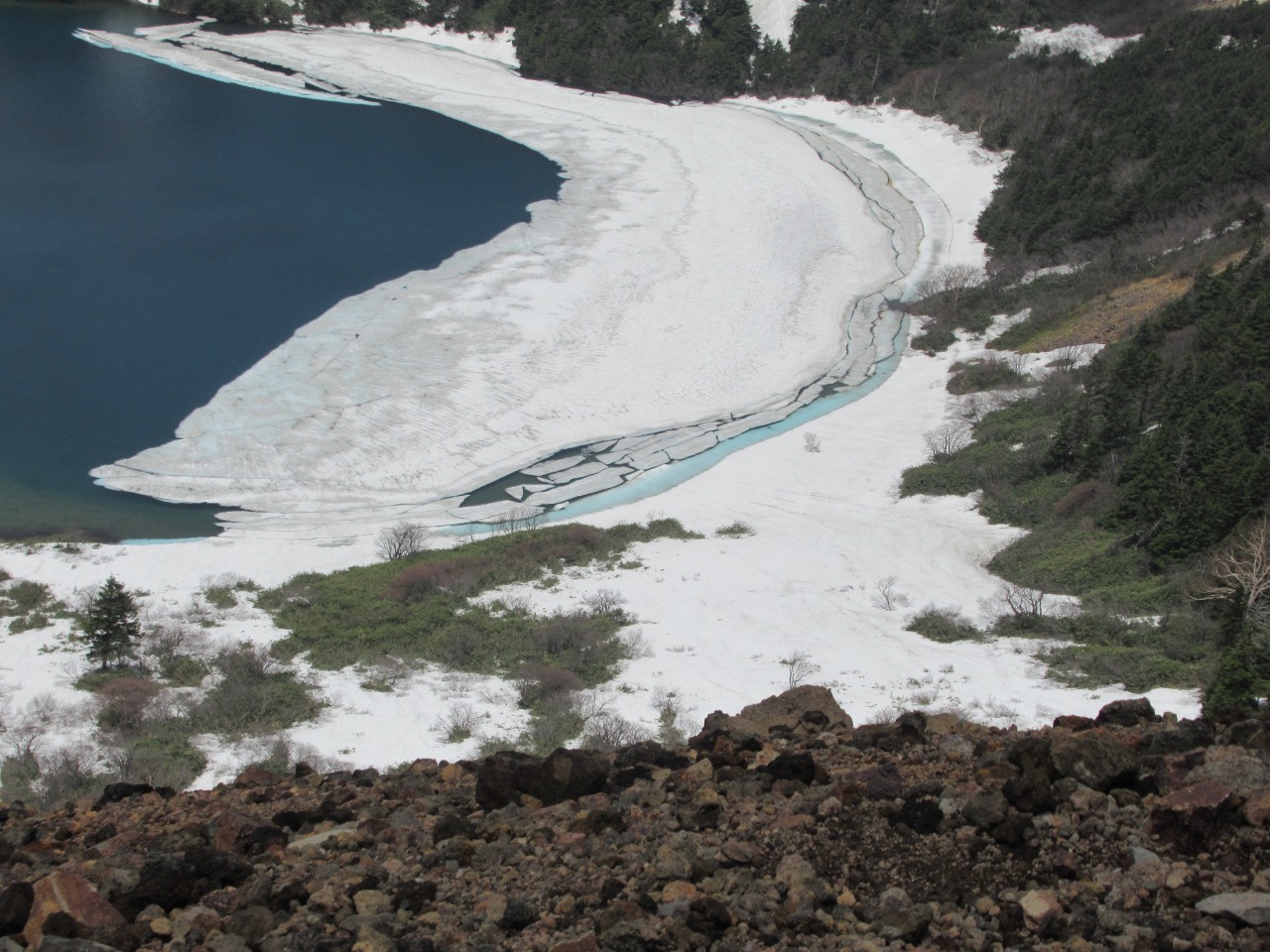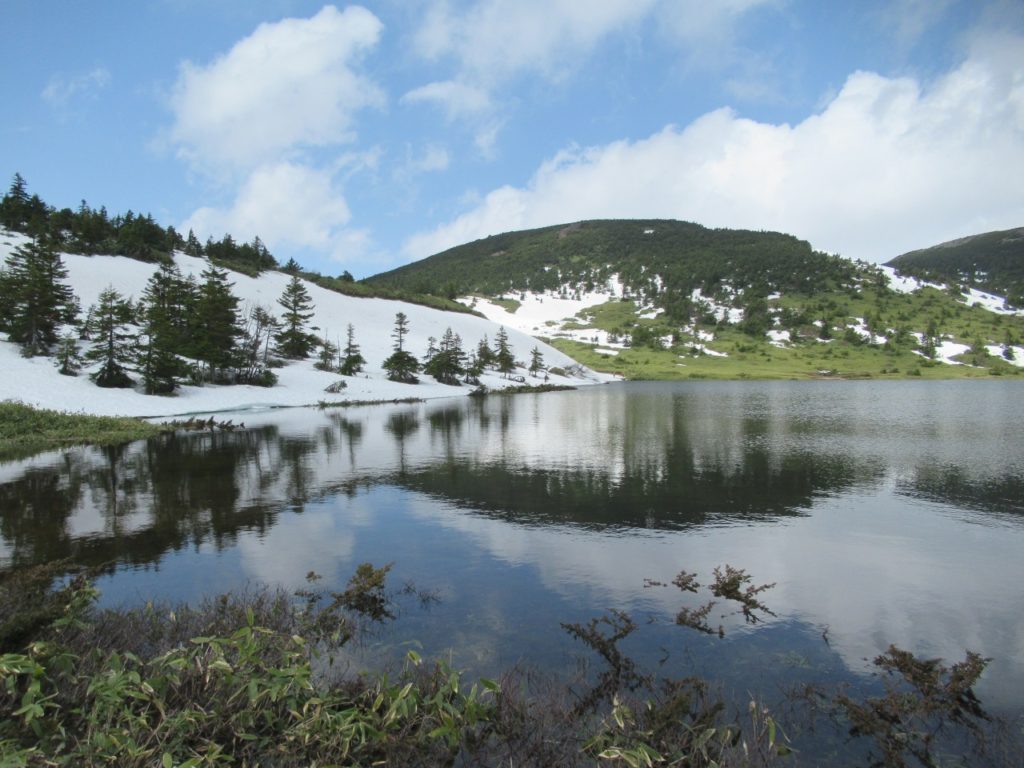 山頂を後にし、少し下ると青空の下に東吾妻山、これから向かう鎌沼が綺麗に見えます。湖畔の木道は半分位雪を被り、雪解け水で水かさが増し湖畔の植物も綺麗な水の中です。雪渓に怪しげな大きな亀裂が走り、足早に歩を進めますが、2時間程後に通った方の投稿ではこの亀裂が幅5m、長さ15m程崩落した様で、ドボンしなくて良かったと胸をなでおろしました。風が穏やかな所では残雪の前大巓が綺麗に湖面に映り、昨夏訪れた八方池を彷彿させます。