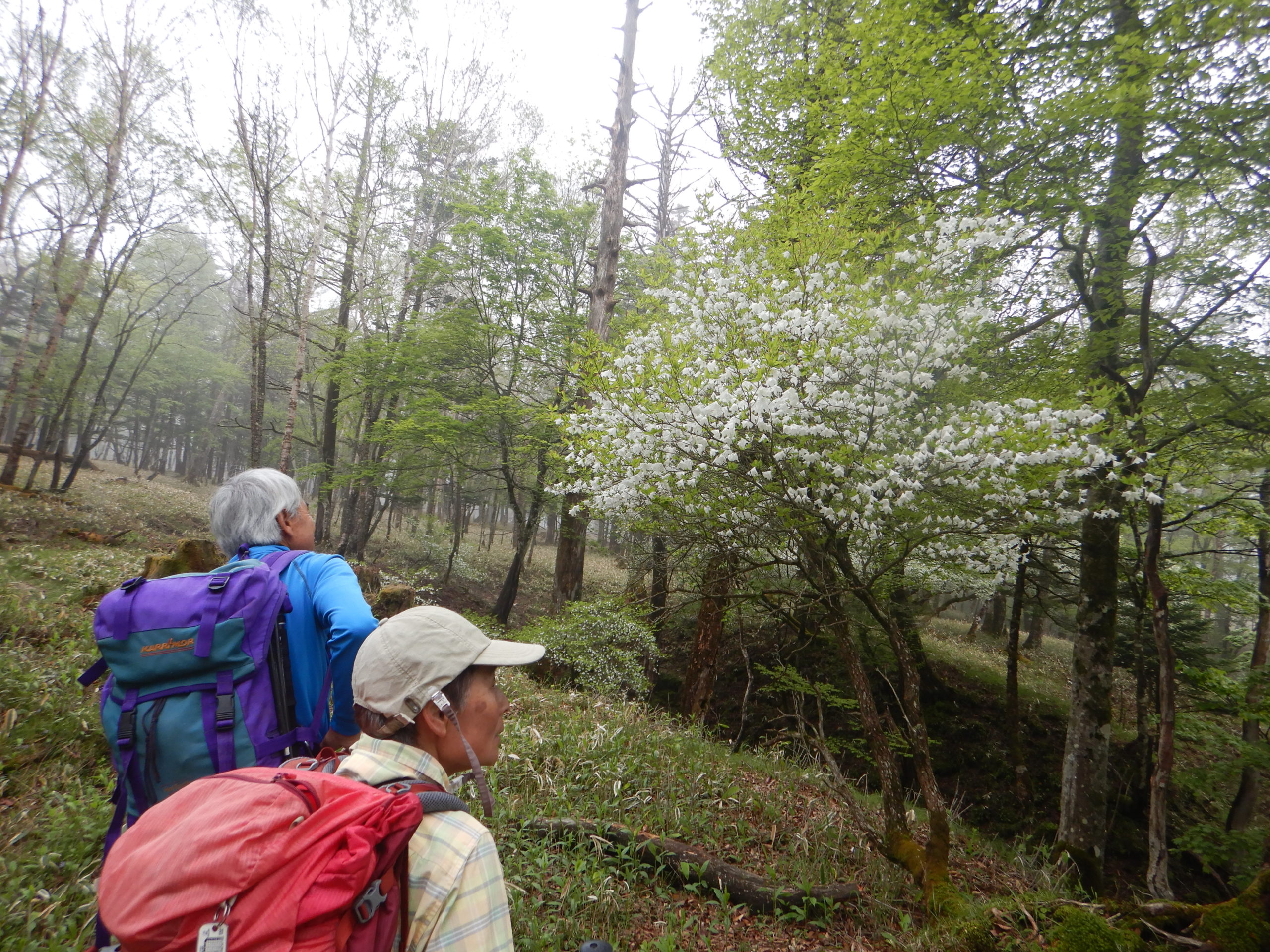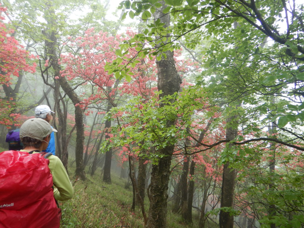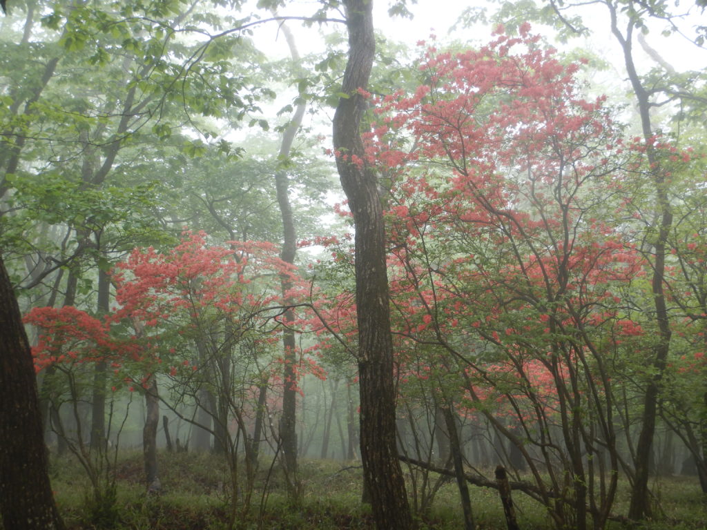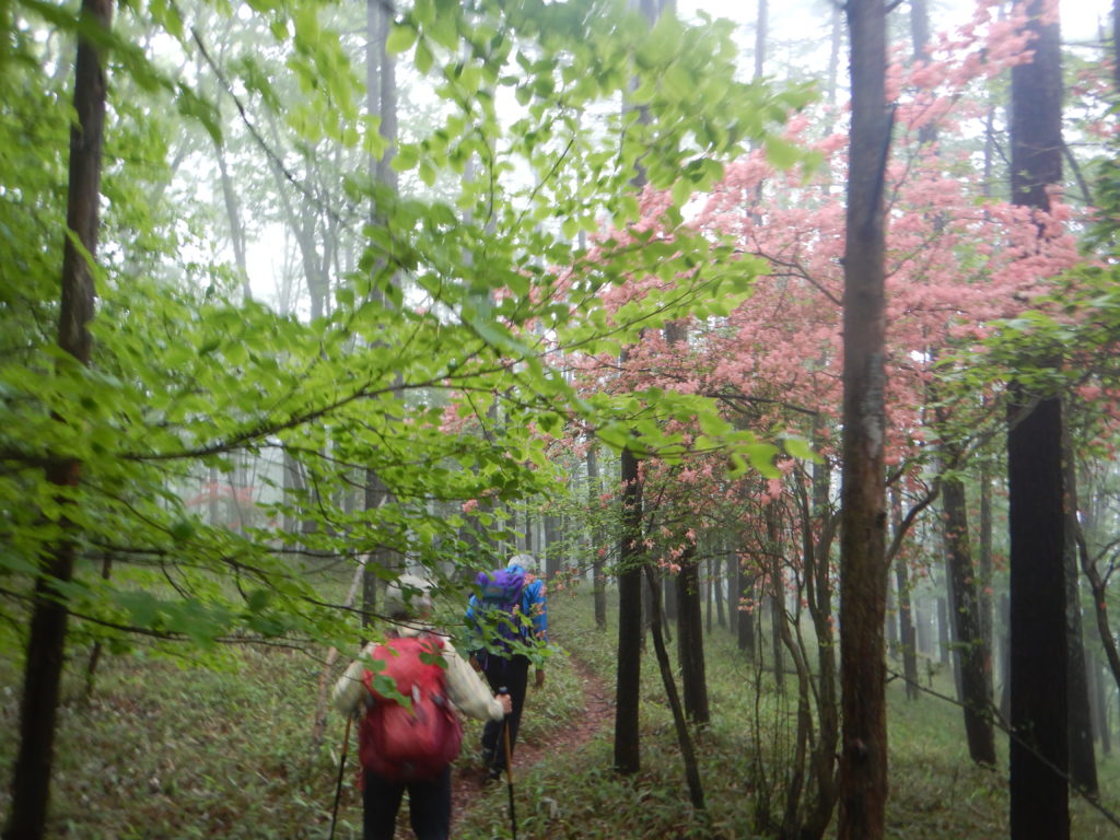 細尾峠から薬師岳までは痩せ尾根から急登のつづら折りを進みます。いつもは地面ばかり見てガマンの登りですが、この日はシロヤシオの群生を眺めながらの、疲れを忘れさせてくれる登りでした。地図では1時間弱の登りですが、今日は半分の時間で通過。まさに「シロヤシオの癒やし効果」のおかげでした。男体山、女峰山を望めるはずの薬師岳もこの日はガスに覆われているため、ただの休憩場所でした。ここから先は禅頂行者の道らしく、上り下りはあるものの、雑木林の低い笹が一面広がる歩きやすい道になります。まるで近所の公園の散歩コースのようでした。