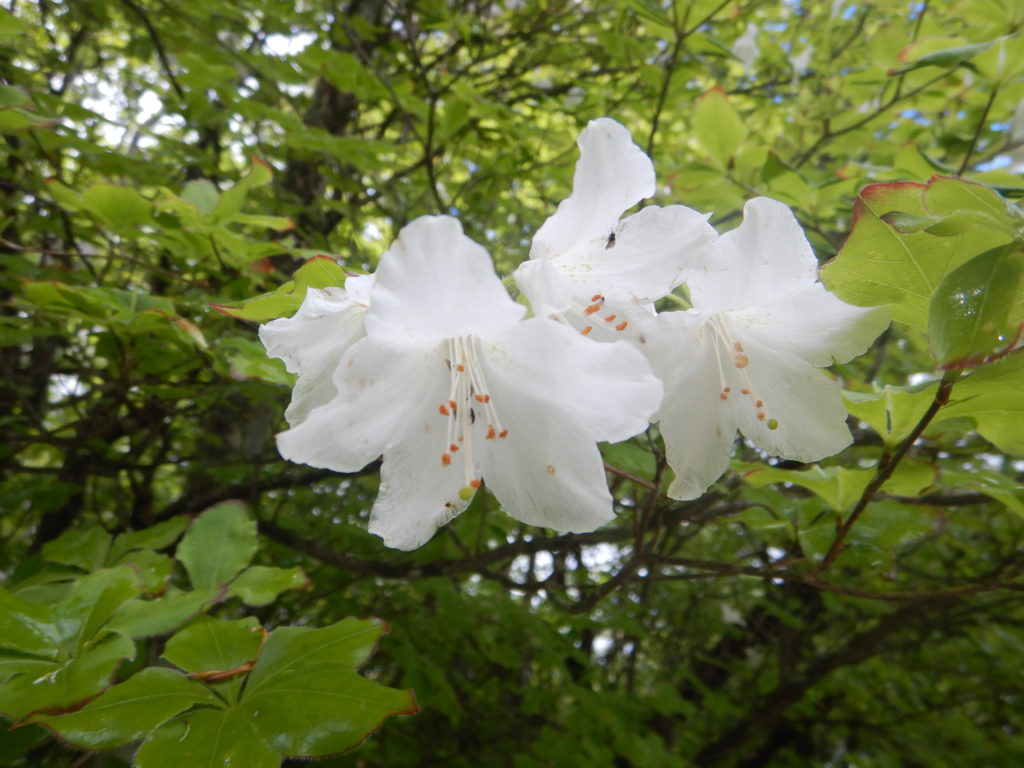 茶ノ木平から細尾峠までの下りは、ところどころ急坂があり、スリップに気ををつけながら進みました。ここの下りもシロヤシオや、終わりを迎えているアカヤシオにも出会うことができました。昨日の強風の影響か? あちこち花の色を残したまま花びらが落ちており、これもまたきれいな模様に感じました。