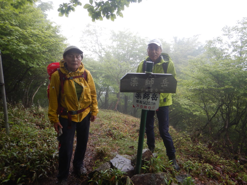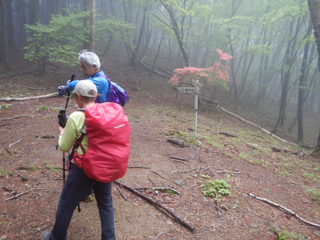 細尾峠では霧雨が強くなり、雨具の上着だけ着ました。濡れた枯れ葉の上にザックを置いて、雨具の準備をしていると、枯れ葉の裏からヤマビルが現われ、あわててザックを持ち上げました。隣のさくまさんは、ヤマビルを察してか、最初からザックは濡れた枯れ葉の上には置かずに、抱えていました。