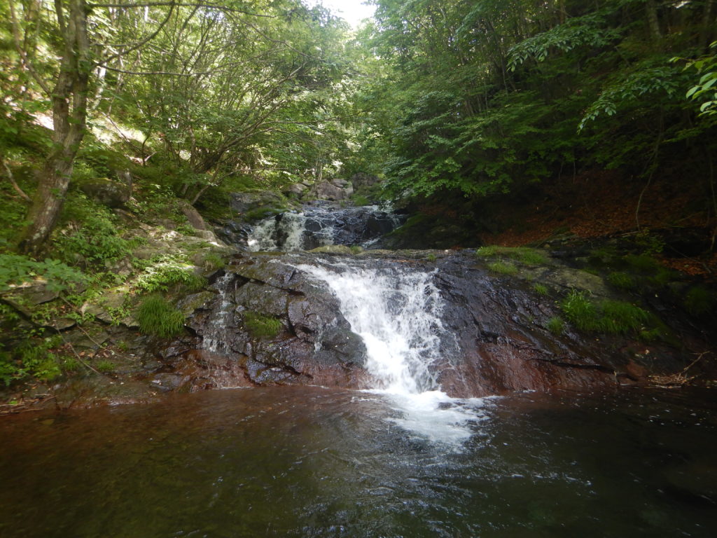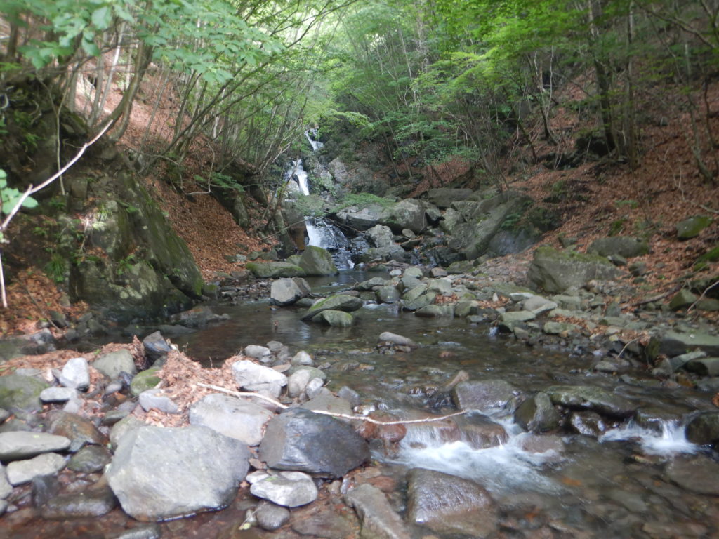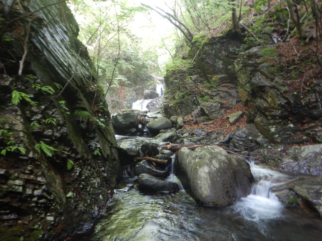 入渓していきなり水流の多い小滝の連続になりますが、ほとんどが直登できて、沢登りの醍醐味を味わくことができました。5つの小滝を越えて、二股の手前で休憩。休んでいても身体が冷えることもない、初夏の沢登りはとても気持ちいいです。
