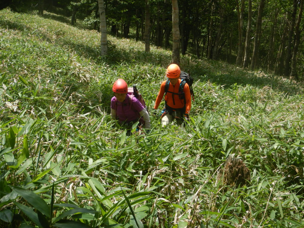 この先、しばらく沢歩きになり、しばらく歩き1:3の二股を右に入る。すぐ左に4mの滝が現われました。この小滝は左から巻くように登りました。さらに進み、沢が浅くなった標高1530mあたりの小沢に入り、そのまま低いヤブ漕ぎを15分ほど進むと、黄色い避難小屋が現われ、袈裟丸山登山道と合流。沢装備から登山靴に履き替えました。