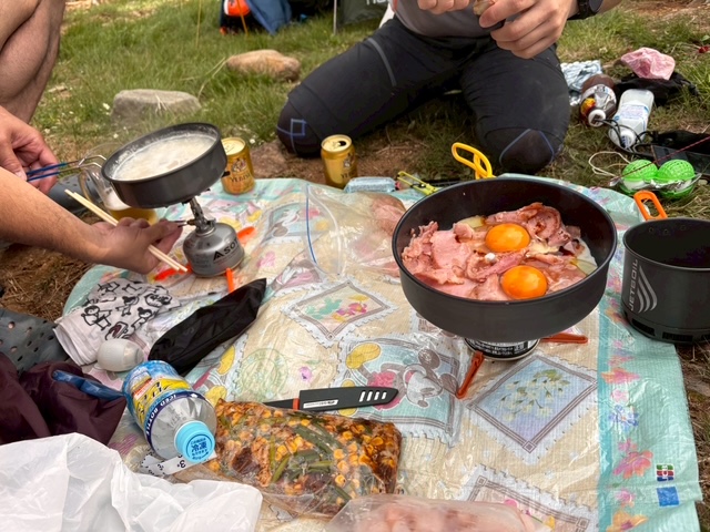 小山を1時に出発し、北信越道経由で佐久から大門街道で蓼科に向かい、美濃戸口に5時頃到着したが、駐車場は満車のため、泣く泣く3.5Kmも離れた八ヶ岳自然園駐車場に駐車。ここからゆっくりと美濃戸口まで車道を歩いた。我々と同じように自然園に向かう車もいた。美濃戸口でトイレを借りて、登山道に向かうと、他の車はどうしているのだろうと思ったら、舟山十字路に向かう車道に縦列駐車しているではないか。これは反則だろうと思いつつゆっくり林道を進んだ。登山客はべらぼうに多い。BMWのセダンが異様に遅い速度で林道を進んできて、その後ろにジムニーやスバルのSUVが連なっていた。BMWは場違いで顰蹙だった。林道をショートカットできるところはして、美濃戸山荘に到着。駐車場はいっぱいだった。ここからさらに林道を進み、堰堤広場(1950mあたりでここまでは車が入れる、自転車もこれるので今度電動アシストマウンテンバイクでチャレンジしてみようかとも思った)で小休止。ここから登山道となり沢沿いの道が涼しくて気持ち良い。赤岳鉱泉に着いた時にはそれなりの数のテントがすでに張られていた。まずはテントを張って小屋に行き受付を済ませ、私ともう一人は行者小屋経由阿弥陀岳、赤岳周回組、あとの二人はなんと天狗岳まで往復するというとんでもない猛者で、別行動になった。我々は行者小屋から赤岳、横岳を左に見ながらゆっくりと九十九折りの道を登って行き、中岳のコルに到着した。途中で信州大学ワンダーフォーゲル部のメンバーと話をして、なんとメンバーの一人は私たちが先日行った四阿山で同じ日に登っていた。ここから阿弥陀岳までの登りが急登で、息が上がりつつ阿弥陀岳に到着した。多くのハイカーが休んでいた。360度の絶景で富士山も中央アルプスも見えた。しばしおにぎりなどを食べて中岳のコルに下りて、また中岳へ登り返しが地味にきつい。そしてここを下りてこの日のラスボス、赤岳への登りだ。九十九折りの道をひたすら登ってゆくと、岩登りが多くなり、キレット分岐からは鎖場となりよじ登ると赤岳山頂に到着。富山県立富山高校の山岳部?がきていた。狭いので写真を撮ってすぐに頂上山荘に向かった。私も連れもトイレを我慢していたので、ここでできたのはありがたかった。北アルプスも富士山も見渡せて満足し、下山を開始した。若者がたくさん現れて、青山学院大学のハイキング部と山岳部が団体できており、信州大学と青学の垢抜け具合を連れが指摘した。文三郎道で下りたが、マムート階段が崩れてきており、石がゴロゴロのっているので、階段に足を乗せるのが危ないところ多数あり、補修できないのであろう。注意深く行者小屋まで行き、水を仕入れて(赤岳鉱泉は水の出る水道がトイレの中にありなんとなく汚く見える)、テントに戻った。まだ天狗岳まで行った二人は戻ってきておらず、しばし休憩した。4人揃ったところで夕食開始。牛タン、そして新たなメンバーが持ってきたベーコンと卵、そしてペルガモンで味付けされた肉、シーフードの入ったガーリックトマト味のパスタを食べた。この山飯は最強だった。小屋で生ビール2杯、レモンサワー2本を買ってきて飲んで、大いに盛り上がった。隣のテントはハイパーライトのオールダイニーマ素材のタープとビビーの組み合わせで、これは初めて見た。そのハイカーはユーチューバー(本職は別にあり)で、夜中2時に阿弥陀岳にゆきドローンを飛ばしたり、天の川を撮影したりすごい人だった(PEAK TUNESという名前でYOU TUBEで検索すると出てきます)。このかたが翌日神となるのは後述する。翌日朝は3時に起きて準備をし、4時40分に私ともう一人は行者小屋経由地蔵の頭に向かい、横岳、。硫黄岳を周回、もう2人は硫黄岳から赤岳まで逆回りで出発した。地蔵の頭までは埼玉県立川越高校山岳部と昨日会った青学ハイキング部と同じペースで登っていた。最後はハシゴの連続となり、この頃には強風が吹き始め、地蔵の頭に到着すると爆風で、二人でうーん、厳しいねと言いつつ爆風の時には耐風姿勢を取りながら稜線をゆっくり進んだ。ハシゴなどでは反対側からくる物凄くゆっくり下りてくるハイカーを爆風の中待ちながら、そんなにゆっくりではハシゴにしがみついていたら、爆風来るだろうにと思っていた。横岳ではクラブツーリズムと思しきハイカーの軍団がおり、山名板の真横で何かを食べているおじさんがみんな写真を撮るのにその人入ってしまうので、私は「山名版の真横から少しズレていただきけますか?」と話しかけると、「これを風除けにしてんだからしょうがねえだろ」と意味不明の答えだったので、そのおじさんいりの写真を撮って、すぐ先に進んだ。硫黄岳の稜線上は遮るものがなく爆風はさらにすごくなり、いっとき大きな岩の後ろに隠れてやり過ごし、風が吹いたら姿勢をとってなんとか硫黄岳山頂に到着。爆裂火口の周囲を見てから峰の松目を見たが、風が