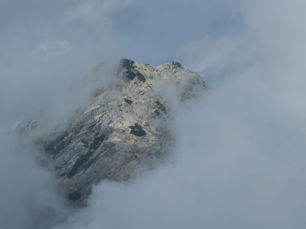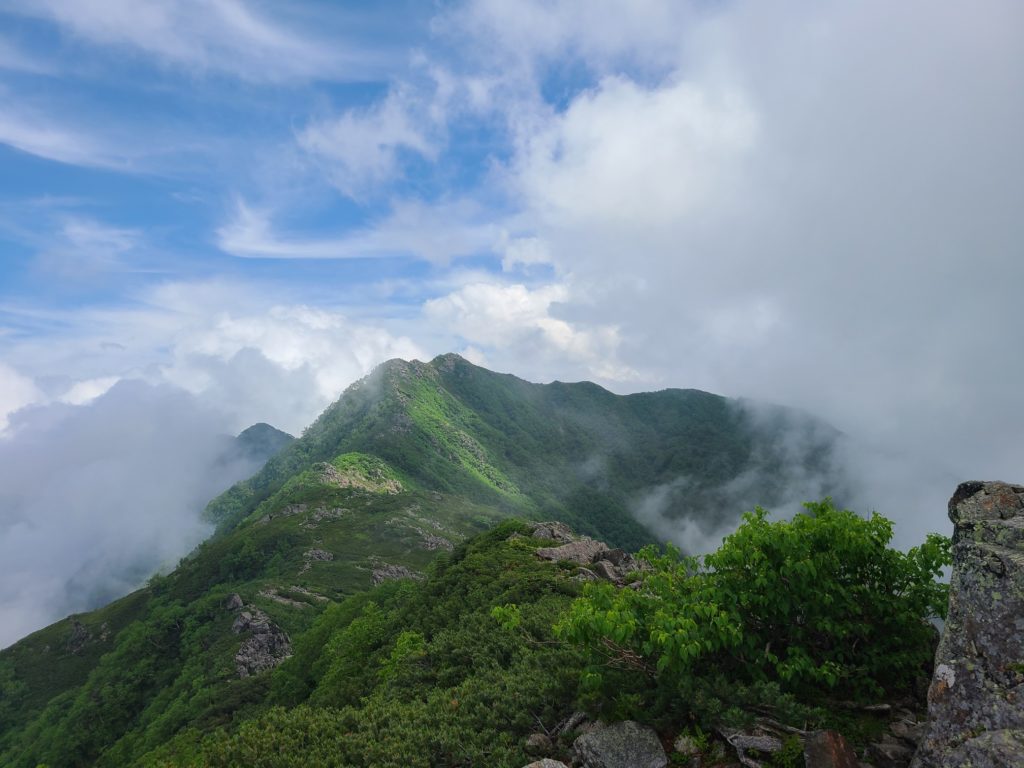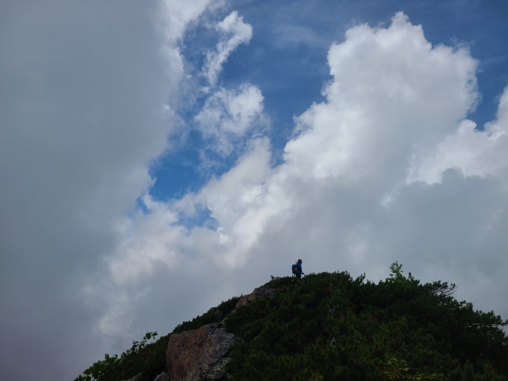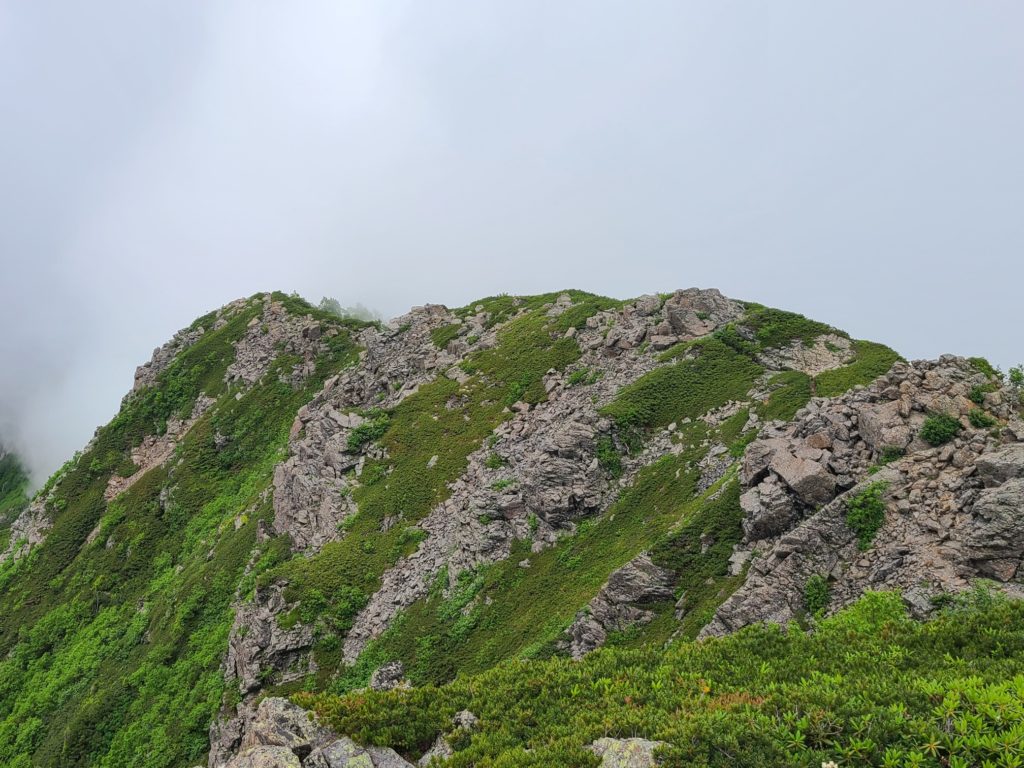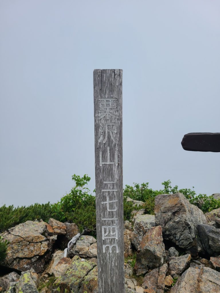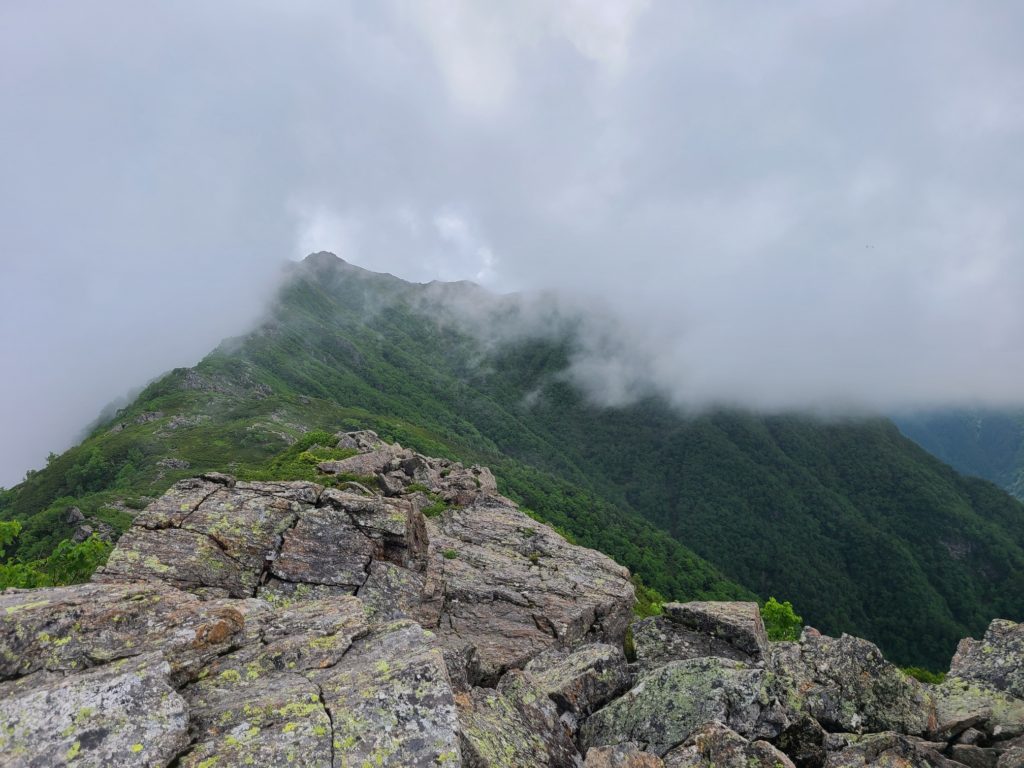 まだ歩いたことのない山へということで栗沢山とアサヨ峰へ行ってきました。平日なので始発のバスは8時。小型バス3台が出ました。栗沢山へ向かうのは私達だけです。ガスがわいてきて展望は期待できそうにありません。蒸し暑い樹林帯の急登をひたすら登り2時間で栗沢山へ、甲斐駒はガスの中。岩を下りてアサヨ峰へ向かいました。アサヨ峰へは岩稜帯を1時間。稜線では登山者には一人も会いませんでした。もちろんアサヨ峰山頂は貸し切りです。休憩を取り栗沢山へ戻りました。栗沢山で休んでいると一瞬ガスの切れ間から甲斐駒ヶ岳が顔をのぞかせてくれました。仙水峠への急坂を下り分岐に出ると雨が本降りになってしまいました。ピストンで降りればよかったと思っても後の祭り、びしょぬれで宿に着きました。乾燥室で乾かしましたが生乾きでした。宿はツアーグループや女性が多く泊まっていました。翌日ほとんどの人が甲斐駒ヶ岳に登るとのことでした。