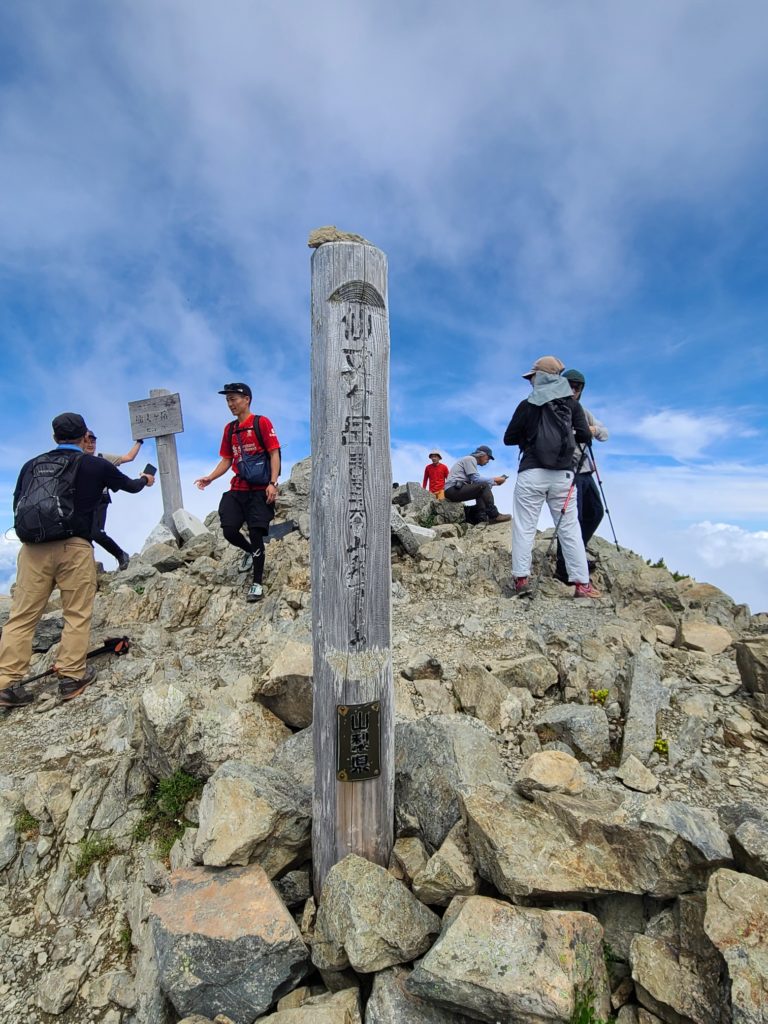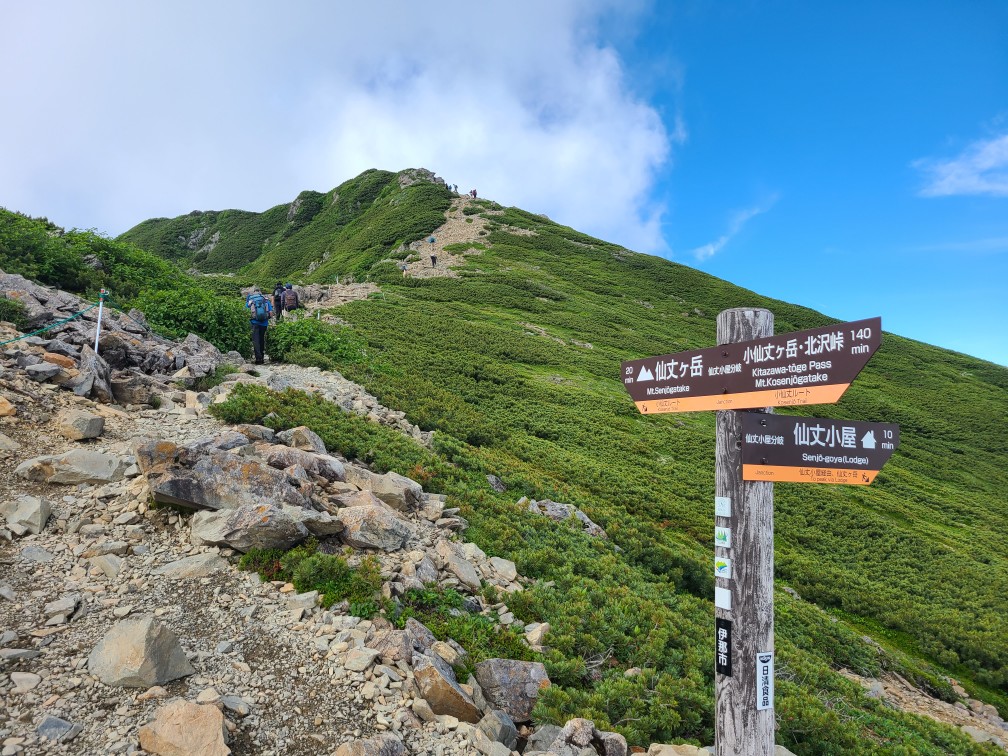 朝起きるとまだ雨が降っていました。今日は晴れるはずです、と管理人さん。昼になるとガスが出てしまうので早くに出発したほうがいいというので雨が止むのを待ち5時過ぎに出ました。しずくが落ちて湿気の多い樹林帯の急登を登ります。南アルプスはどこも登り始めは急登です。合目標識があるので目標に頑張れます。6合目から樹林帯を抜け青空が広がり展望が期待できそうです。振り返ると甲斐駒ヶ岳と前日登った栗沢山とアサヨ峰の稜線が良く見えます。北アルプスも見えます。小仙丈ケ岳は最高の展望でした。お花のほうはパラパラとありますが時期はもう過ぎてしまった感じです。山頂まであと1時間ひと頑張り。展望も良いので途中お花を見たり景色を見たり。昨日とは違い土曜日でもあるので続々と登山者に抜かれていきます。山頂も賑やかでした。仙丈小屋、馬瀬ヒュッテ経由で13時のバスに間に合うよう頑張っておりました。帰りのバスは39人乗りで大型でした。仙流荘で昼食と汗を流し帰路につきました。