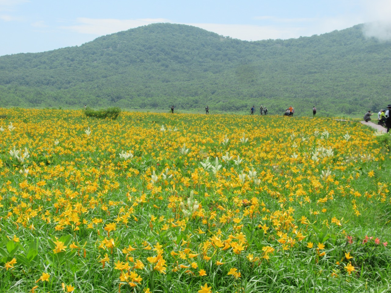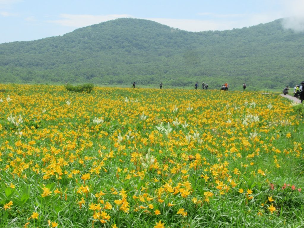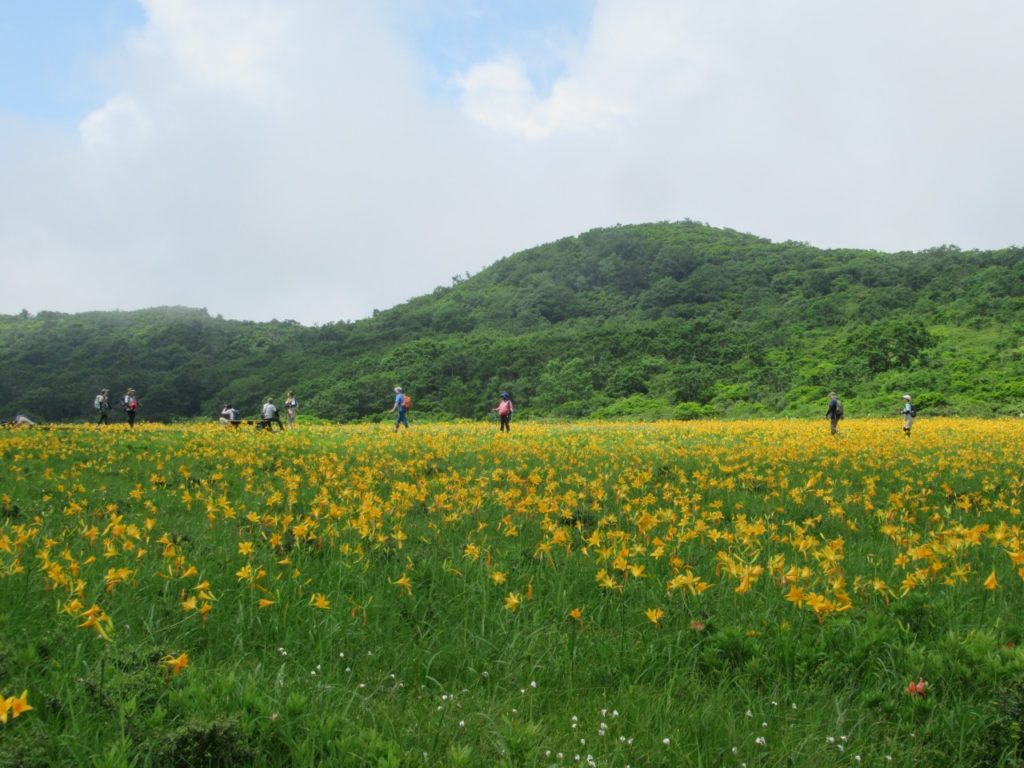 八方台から雄国沼に向かう人はそれ程多くはありませんでしたが、雄国沼休憩舎にはシャトルバスで雄子沢登山口から続々とハイカーがやって来ます。小休止し湿原に向かうと一面オレンジ色のキスゲが目に飛び込んで来ました。雄国沼監視員の方の話では「昨年は疎らだったが、今年は一面良く咲いた。」とのことで、どうやら当たり年で、時期もドンピシャの様で、たっぷり1時間散策を楽しみました。