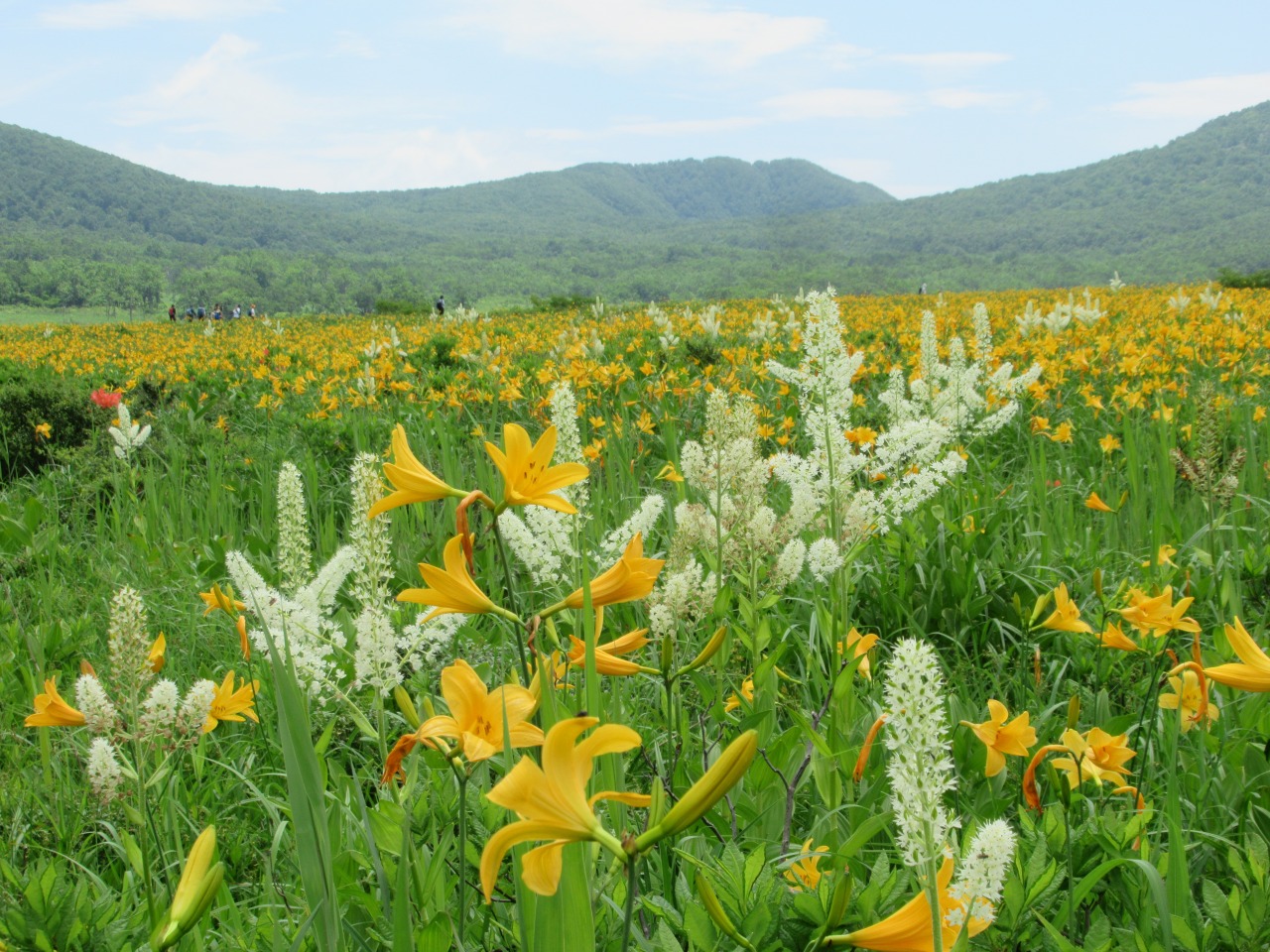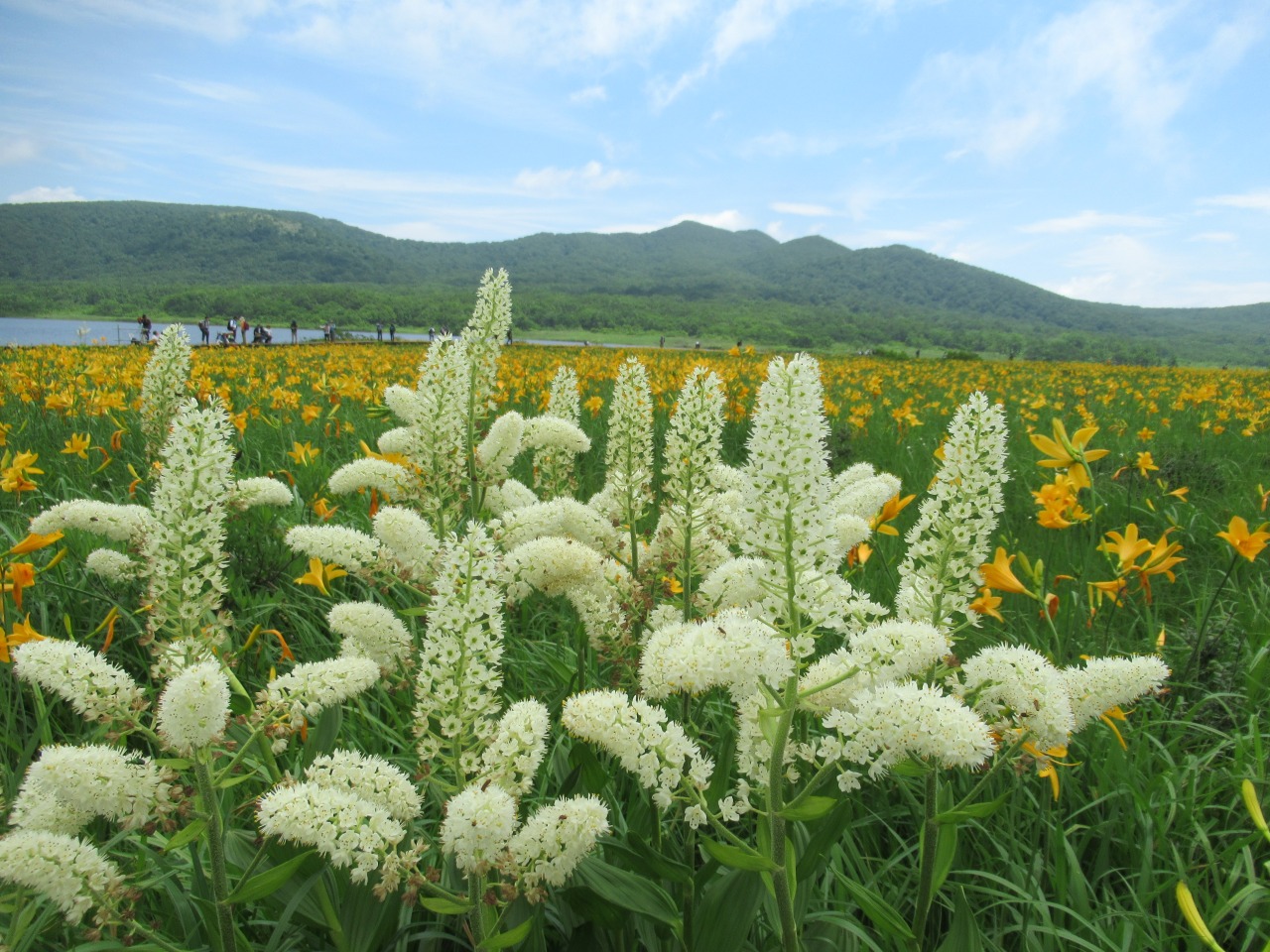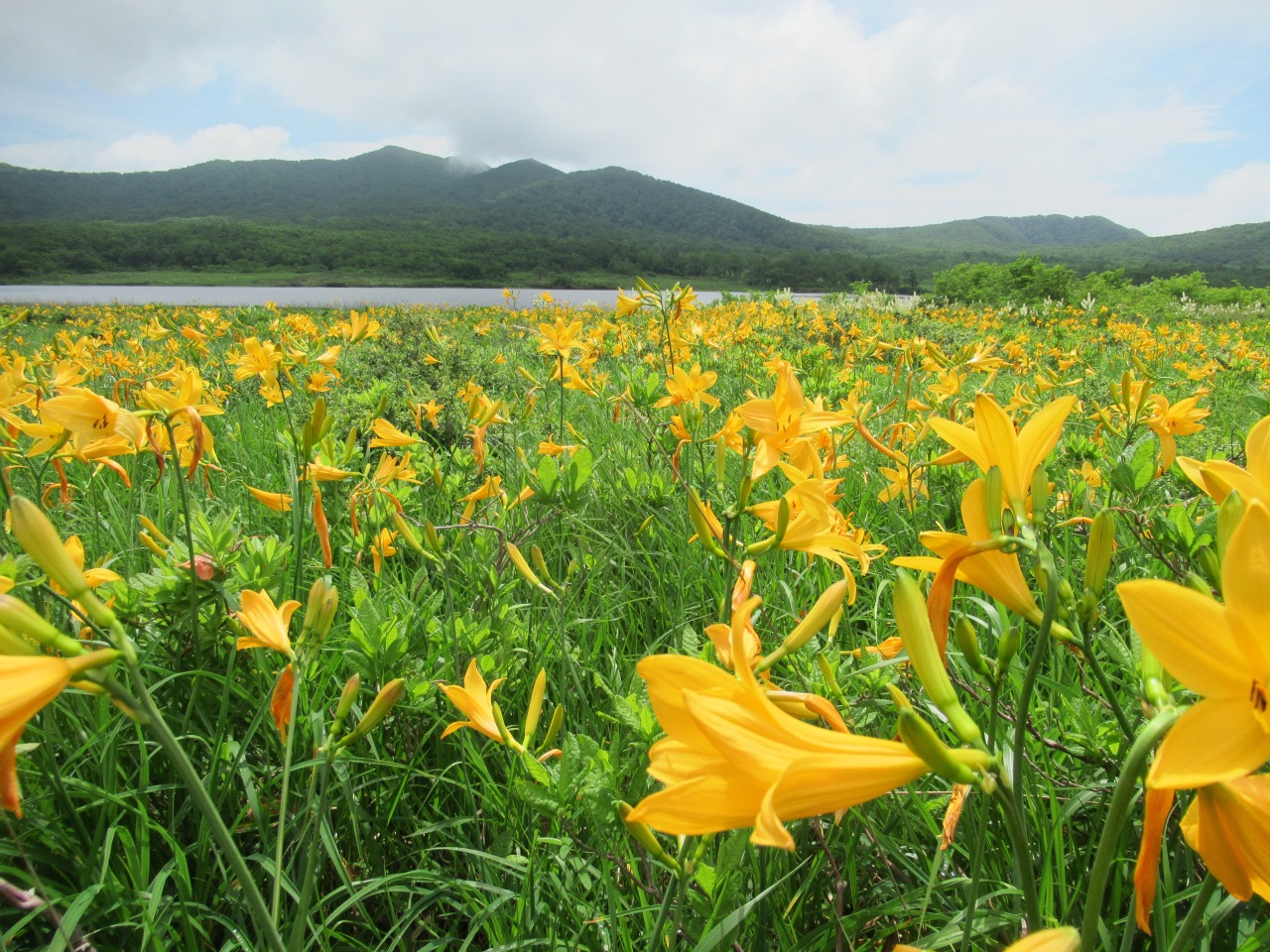 八方台から雄国沼に向かう人はそれ程多くはありませんでしたが、雄国沼休憩舎にはシャトルバスで雄子沢登山口から続々とハイカーがやって来ます。小休止し湿原に向かうと一面オレンジ色のキスゲが目に飛び込んで来ました。雄国沼監視員の方の話では「昨年は疎らだったが、今年は一面良く咲いた。」とのことで、どうやら当たり年で、時期もドンピシャの様で、たっぷり1時間散策を楽しみました。