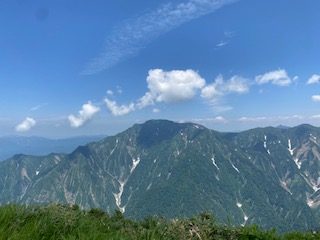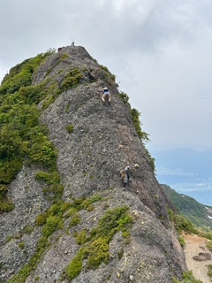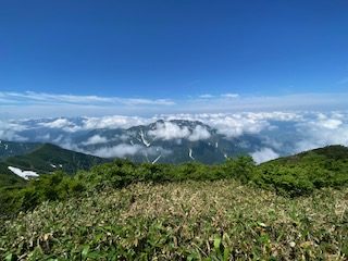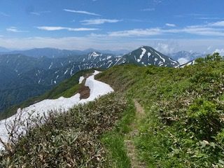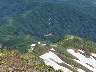 小山を2時に出発し、関越道で魚沼ICから駒の湯に向かい、4時45分頃駐車場到着したがすでに数台停まっていた。登山口よりすぐ橋を渡りは、まもなく大きな熊のフンがあり、そこからしばらくは樹林の中の急登が続いた。木道は段差が大きく木の根の段差も大きいので、大腿に負荷がかかる。小倉山まではガスの中をひたすら多量の汗をかきながら登り続けた。急斜面では鎖のところあり登りはまだ良かったが、下りでは滑って仕方がなかった。小倉山に展望はなかった。その後雪渓が少しあったりして前駒あたりに出ると晴れてパーっと視界が開けて、駒ヶ岳とその周囲のゼブラ模様が見えてきた。登山道に一人中年男性が出血した下腿と膝を抑えながら横たわっていて、横で2人のハイカーが電話で救急要請の電話をしていた。「大丈夫ですか」と聞くと、横たわっている人は「大丈夫です」、電話をしていた女性のハイカーが「今連絡したので大丈夫です」というので、我々は先に進んだ。夏道と雪があるルートは違うようで、雪渓を渡って指示通り進み駒の小屋の手前の岩場の急登を登り切り、駒の小屋に到着。管理人はいないようで、じゃんじゃん出ている冷たい雪解け水を「甘露 甘露」と言いつついただいた。トイレはバイオトイレで自転車を漕ぐタイプだった。便器の前の方が浅いので男性は気をつけないと体の一部が着地して気持ちが悪い。山頂まではやや急な雪渓が出てくるが、登りはつぼ足で問題なく登頂した。ランチタイムはジェットボイルでお湯を沸かし、セブンイレブンのゆず塩鶏白湯うどん、微妙な味。数人のハイカーがいて、怪我人の話も出た。360度の展望で、中の岳避難小屋が見えて、荒沢岳の尖った山容や明日登る予定の八海山の鋭い8峰もしっかり見えて、皆しばらく写真を撮りまくった。一休みして、このまま下山ではもったいないねということになり、中の岳方面へしばらく進んでいった。諏訪平を過ぎて天狗平に向かう尾根が細尾根で急な下りであったので、ここから引き返した。駒の小屋に向かう途中、怪我人を救助に来たドクターヘリの真っ赤な機体が轟音と共に現れて、怪我人がいる上空でホバリングを始めた。しばらく見ているとそこから救助隊員がロープで降りてきて、その後ヘリは現場を離れて、山の周囲に旋回を始めた。写真を撮っていると、ヘリが現場に戻ってホバリングを始めて、怪我人とともに救助隊員がヘリに戻って、魚沼市街地方面へ飛んでいった。遠くではあったが、山中でドクターヘリ救援現場を見たことはなかったので、ありがたいことだと改めた思った。駒の小屋手前の雪渓の下りは短かったが、軽アイゼンで下りた。駒の小屋には管理人さんが到着して、ザックには根曲がり竹をたくさん背負っていた。「今晩のおかずにする」と言っているので、「どう調理するのですか?」と聞くと、「煮物とかきんぴらとか」と答えてくれた。下山はとにかく滑るのでストップに気を使いながら行くと、皆大腿や膝に負担がきて疲れてくる。こんなに下りは長かったっけと言いつつ、途中休みを入れながら怪我をしないように下った。あまりの暑さに熱中症にならないように、とにかく飲む水の量は半端なかった。登山口では気温は35℃くらいでたまらない暑さ。宿泊先の大湯温泉はすぐそばで、ああついたと思ったら、異様に道が細くクランクなどもあり、「何気にここが今日一番の核心部だね」と連れが言っていた。旅館はなかなかこだわりの作りとなっていたが、温泉自体はこんなものかという感じであった。料理は蛤の酒蒸しが一番のご馳走であった。瓶ビールとスパークリングワインで大いに盛り上がった。温泉に朝入った後に、連れの一人が「なんかここにマダニが噛んでない?」と右の脇の下を見せると、なんとマダニがいるではないか。宿でどこが救急病院で近いですか?と聞いたら「魚沼基幹病院です」と言われ、検索したら26分で到着するので、車の中から病院に今からかかりたいと連絡して行ってみると、田んぼの中にどかんと大きい病院だった。救急患者は他にいないので30分かからずに診察室へ案内され、救急医、研修医がいて、マダニを取った経験のある外科医を呼んでいた。程なく外科医が現れると、救急医は外科医に言われるがままにマダニリムーバーと呼ばれるプラスチックの簡単な器械を、マダニの頭と皮膚の間に突っ込んで、時計方向に回転させて見事にダニは口器を皮膚に残さずに除去された。噛まれている時よりも、取られるときとその後は痛かったらしいが、皆でホッとして八海山に向かった。病院からは25分くらいで何気に近かった。八海山はなんとこの日が山開きの日で混むのが予想され、鎖場で渋滞は?と不安になりつつ八海山ロープウェイ駐車場到着。それほど混んでいなかった。8時40分発に乗る前に、切符売り場で売っていた凍った魚沼の天然水のペットボトルを買って乗り込んだ。往復2400円で7分で700メートル高度を上げ