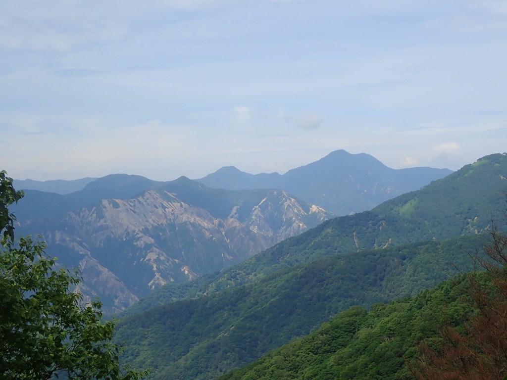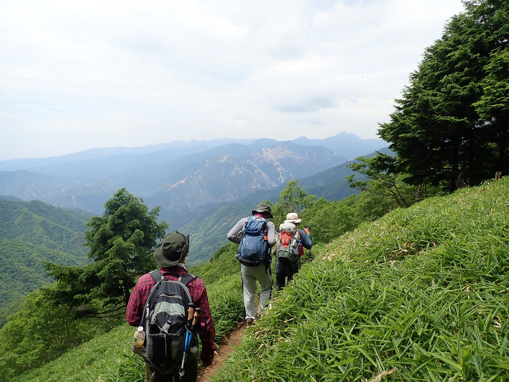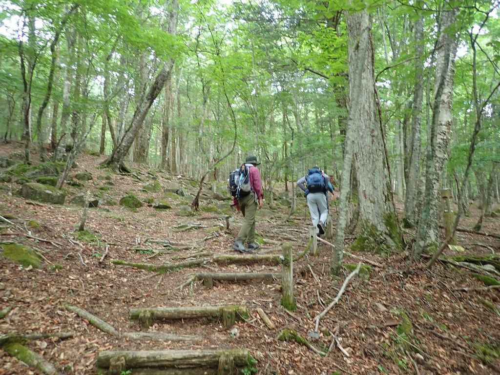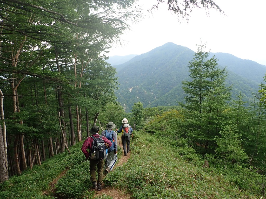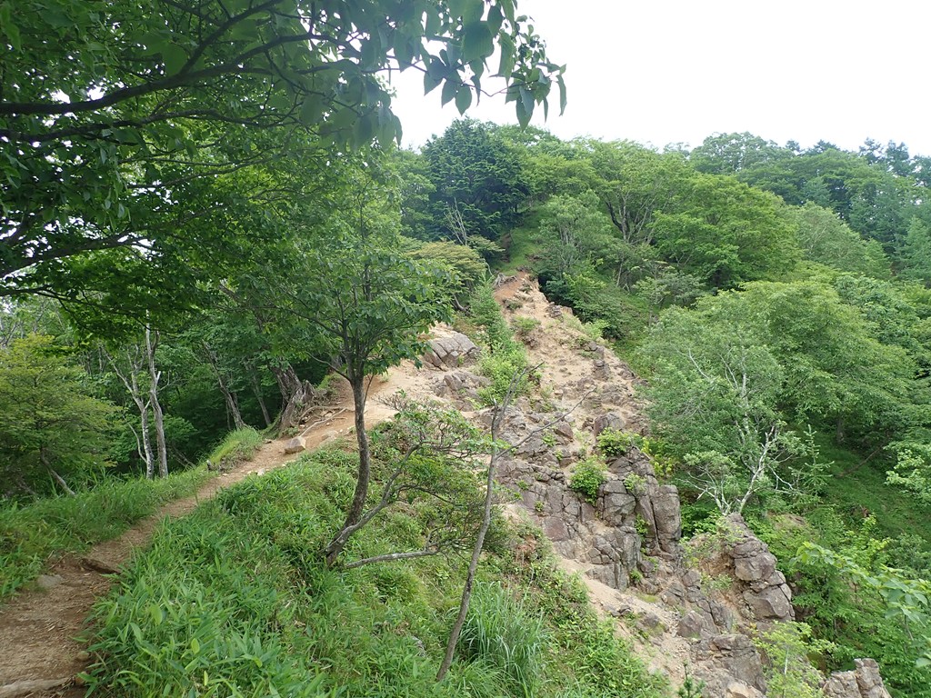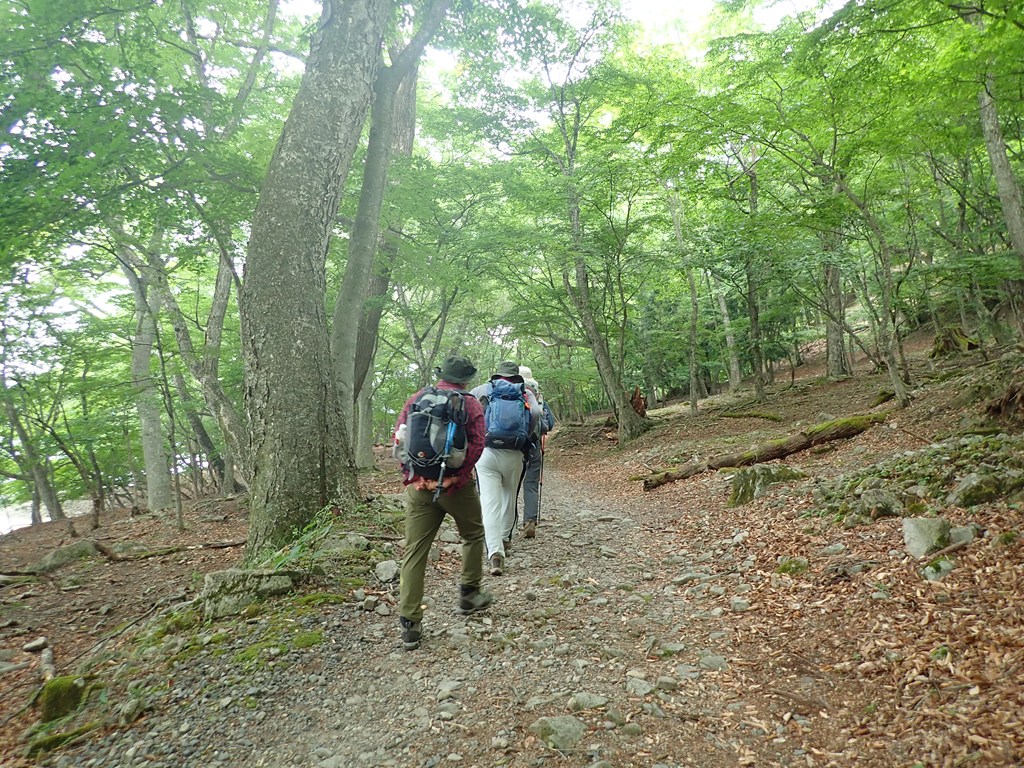 半月山山頂に寄ってから下山開始。下山は気持ちよかった。足尾の山を見ながら笹の急斜面の登山道を下った。わずかな風が心地よい。峠まで下って中善寺山へ登り返す。中善寺山は標高1655m地点のピークだ。私が山を歩きだし頃はそんな山名は無かったと思うのだが10年ぐらい前からよく見るようになった。もう少し進んで1510mピークで一休みした。阿世潟峠から阿世潟まで下り、湖畔沿いの遊歩道を戻った。途中、霧雨を感じたことがあったが、雨に降られることなく駐車場に戻ることができた。駐車場には観光バスでやってきた外国の観光客が大勢散策していた。湖畔に下りている人もいた。