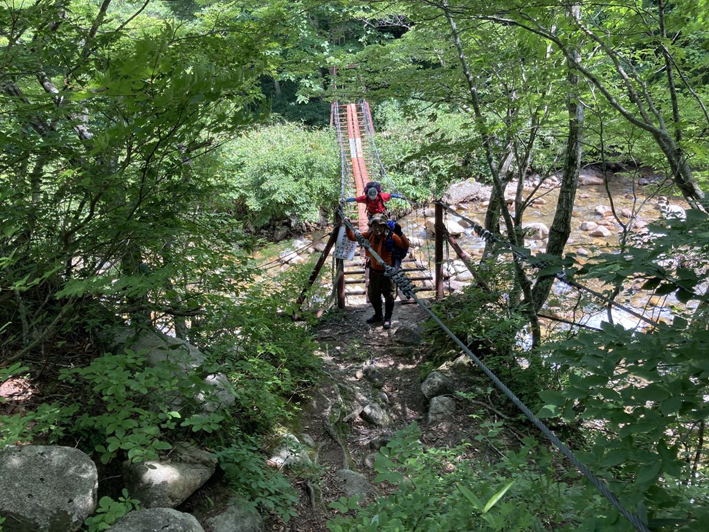 <詳細報告>この河川は堰堤が幾つかあり、工事をしたときの道が残っているはずなので、それを辿って沢を目指す。途中吊り橋があり、橋を渡るときは二人までとの注意書きがある。荷物も多いので一人ずつ渡る。今回は荷物を軽くする意味でビールを一つ減らした。もう若くない。