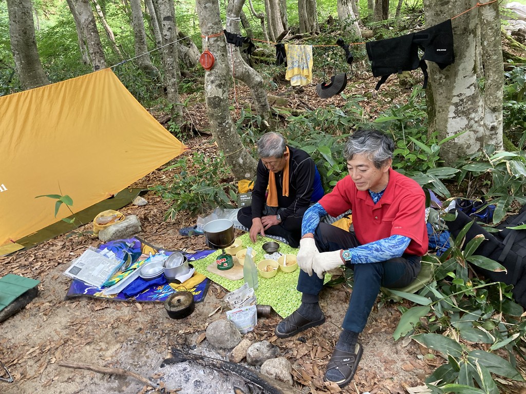 15時30分にタイムアップ、私自身の成果は、釣り上げたものの針が外れてアウト。逃がした魚は大きいというが、、全くその通りだ。もう一匹は10センチほどの小物だが針を飲み込ませてしまい仕方無く持ち帰る、悲しい。釣りを終えてテン場に戻る途中であったが、素晴らしいテン場が見つかった。「何でこんなところにこんなグッドなテン場があったんだ」と皆、驚きと落胆!。釣り前のテン場づくりに費やしたあの貴重な時間が無駄になってしまった。疲れた体でテン場を設営し直すのはしんどい、薪を集め、濡れた物を脱いで火起こしをする。そのころには沢で冷やしておいたビールが飲み頃になっていた。焚火を囲んでさっそく乾杯!この一杯が何もかも忘れさせてくれる至極の一瞬である。後はHさんの摘みと料理で長い夜が始まるのでした。