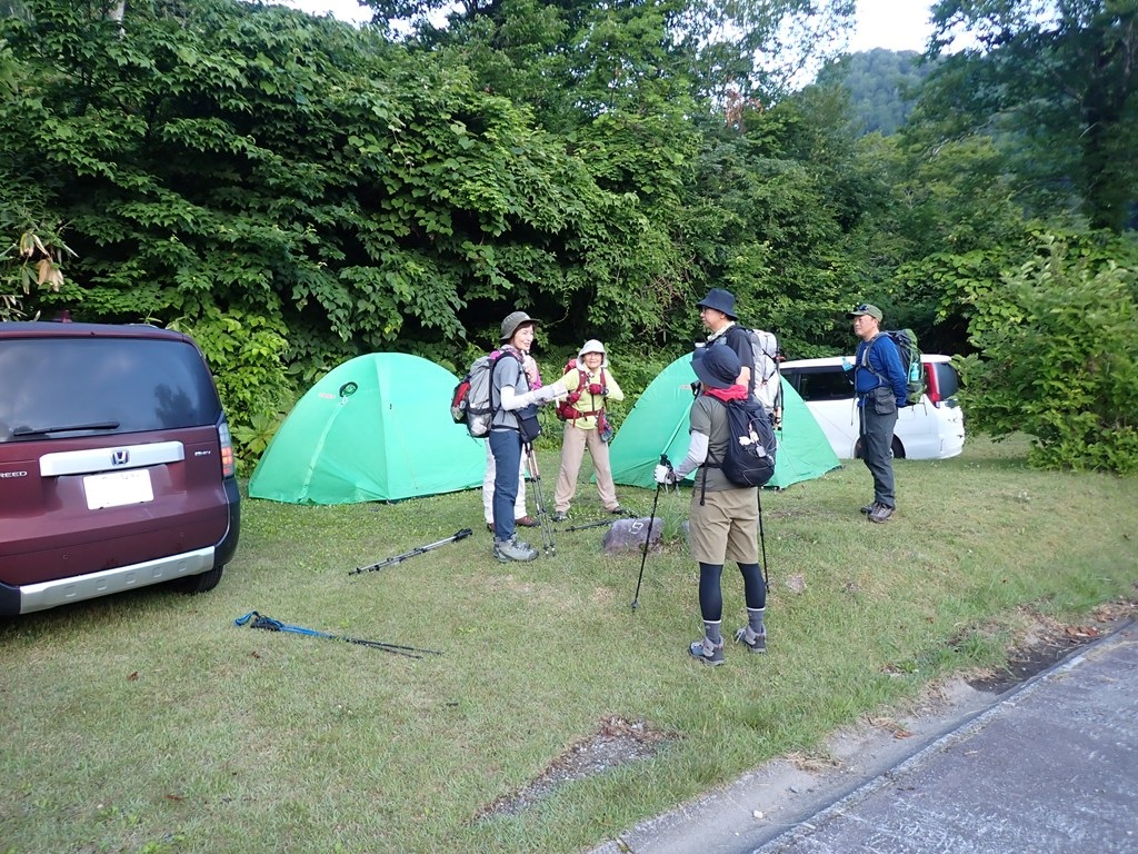 山行当日、4時過ぎに起きだして準備開始。テントは下山までそのままおけるのでありがたい。腰を痛めていた「ともさん」も歩けそうだということで全員で登山開始できた。