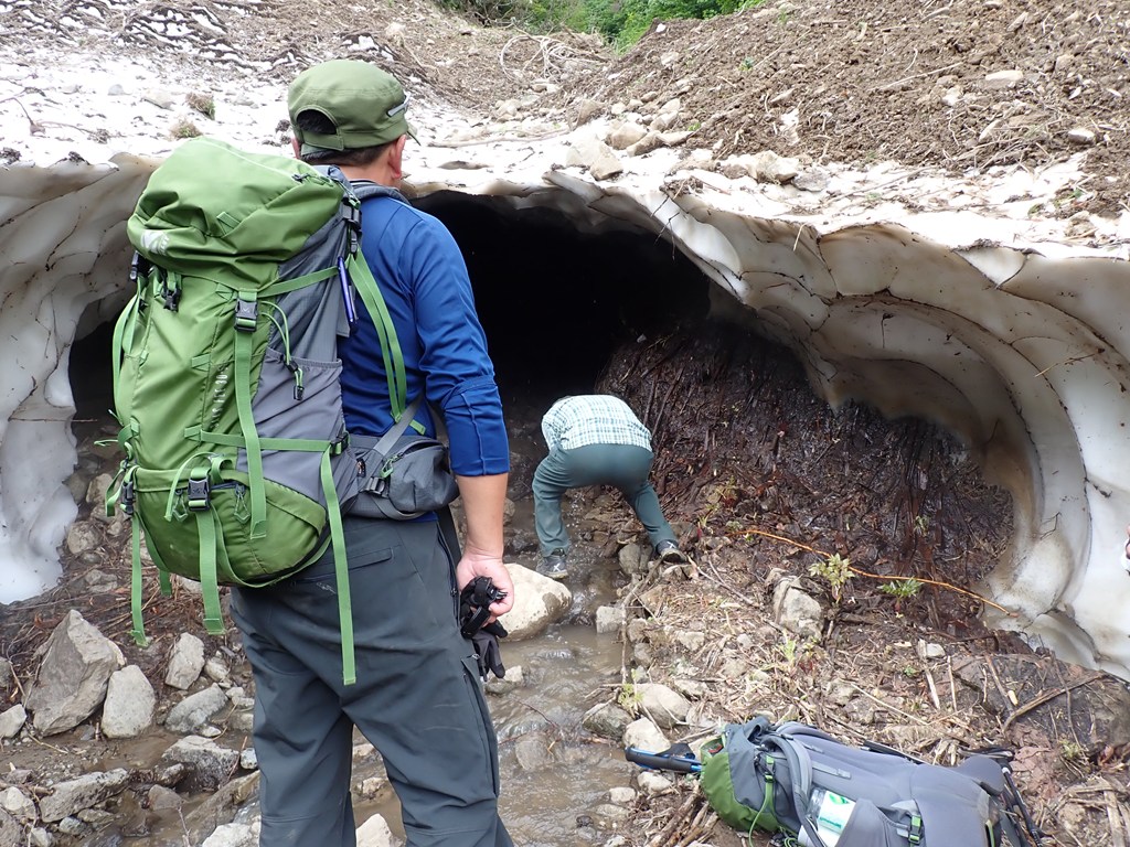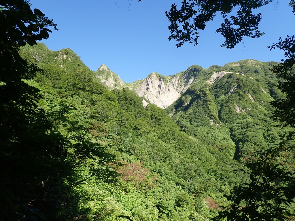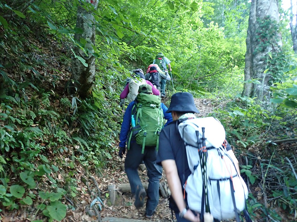 尾根取付から急登が始まる。標高で200mほど登ると傾斜が少しゆるみ、ブナ平と呼ばれる広場に着いた。小休止。その先に携帯トイレブースがある。その先で荒菅沢へ下る。その途中、有名な布団菱の岩壁が見られる場所があった。荒菅沢にはまだ雪渓が残っていてそこを横切る時はひんやりして心地よかった。ただ、残念なことにきれいな飲める水は汲めなかった。穴が開いていてそこに下りることはできるのだが、そこの流れは濁っていた。どうしてだろう。