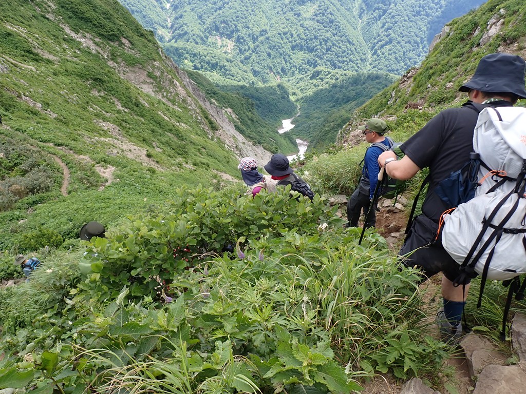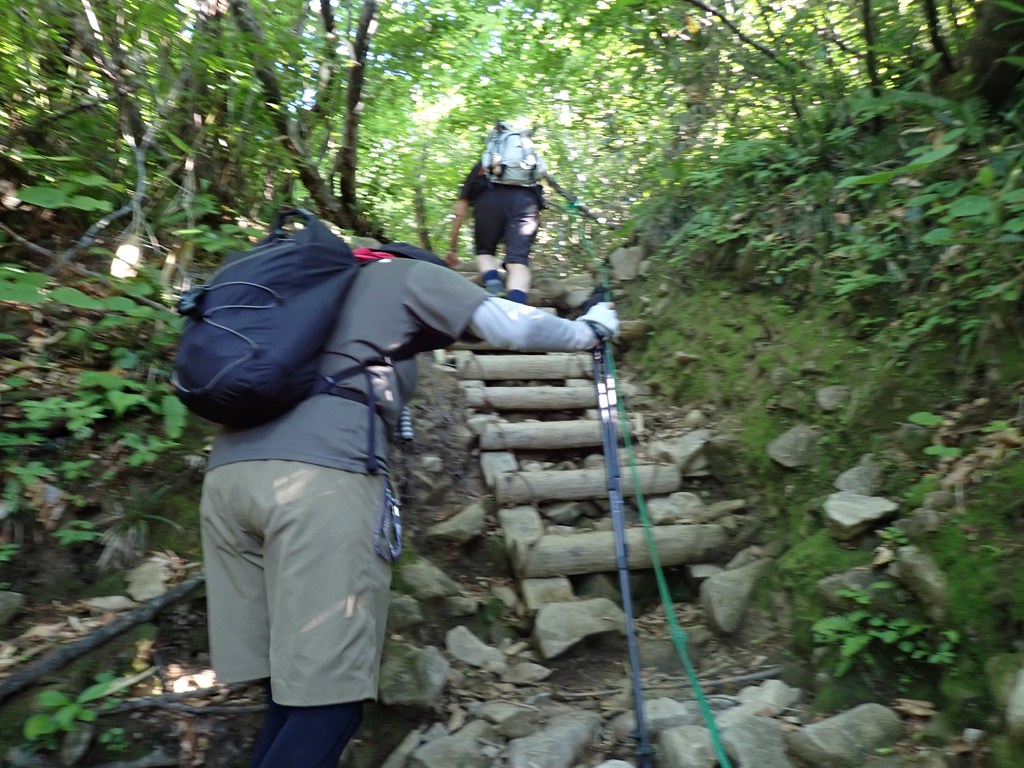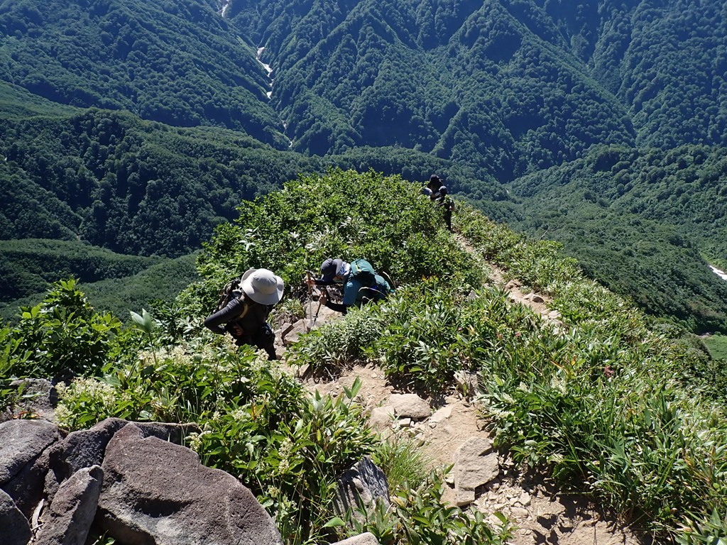 荒菅沢からはそこまで以上の急登が始まる。笹平までは急登の連続でハシゴ、ロープも登場した。標高1700mを過ぎると次第に樹林帯から出てきて、灌木帯に入る。青空に山の眺めも良く、特に尾根を上る登山者を見上げることができる景色は素晴らしい。だが、強い日差しには参った。岩場も多く気を遣う場面が増えてきたが、登山道脇の様々な花が登山者を和ませてくれた。