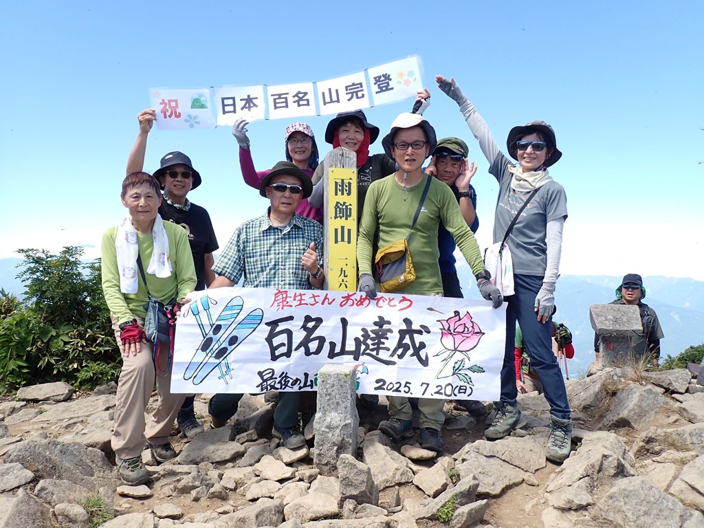 山頂到着。山頂は小さな双耳峰で、南峰が少し標高が高い。どちらもたくさんの人が休んでいる。まず、南峰で「きたはら」さんの百名山踏破達成を祝った。横断幕を広げると他の登山者からも拍手が起こった。南峰に移って大休止。白馬岳は雲に隠れていたがその左には鹿島槍、五竜岳、その右には雪倉岳、朝日岳が見えた。東側は焼山、火打山、金山。鋸のような戸隠連峰も見えた。