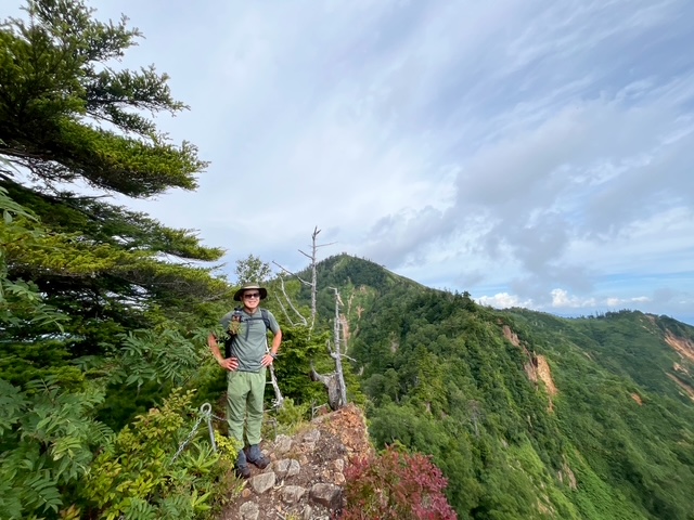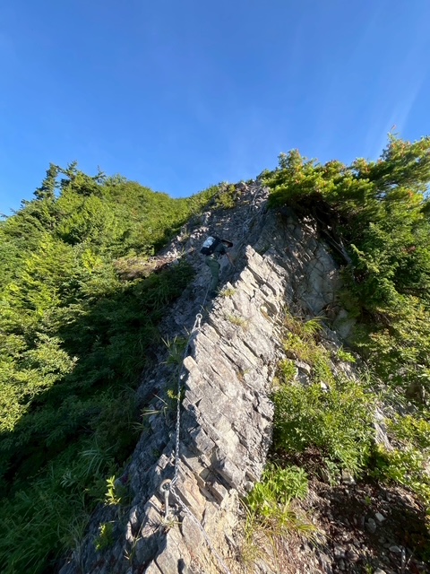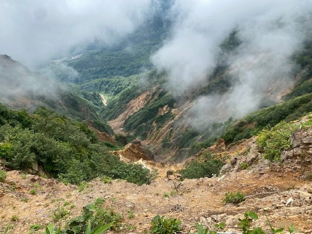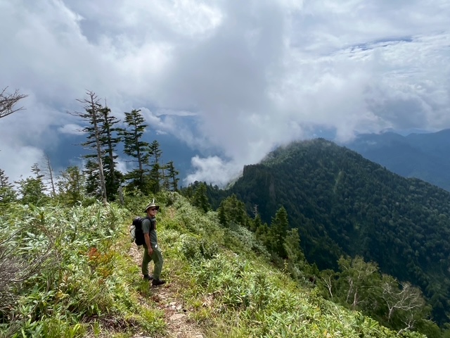 小山を1時30分に出発し関越自動車道湯沢ICでおりて、国道(酷道)405号のすれ違い不可能の道を延々進み、秋山郷のバス停付属の公衆トイレに立ち寄り、そこからしばらく行くと県道507号で屋敷方面へ。屋敷登山口近くの駐車場に電動アシストの折りたたみ自転車を2台デポしておいた。そこからムジナ登山口までゆく。2台の車と1台の自転車があった。我々と逆向きの登山者が1名いるはずだ。登山口の頃は晴れ間も見え、ひたすらな急登を登ってゆく。風がなく暑い。万仏岩から五号目の布岩到着。この辺りではたまに周囲が見渡せるが山しかない。そこから白グラの頭到着。一休みして急登の連続でカミソリ岩到着。一人の登山者とすれ違った。おそらくこの人が自転車をデポした人であろう。やや平らになってまた最期の急登を登ってようやく山頂。山頂は半分しか視界がなく、ガスが上がってきて何も見えなかった。周囲の山々にも黒雲が立ち込めてきて、下山できるまで雨が降らないことを祈った。カップヌードルは緑のたぬき 東 で定番のうまさ。それとセブンイレブンの岩下の新生姜を使った小さなお稲荷さんで腹を満たし、下山開始。途中赤土の斜面が多く、滑る。崩落地はヒヤッとする場所もあったが、登る方向としてはこちらを下にして正解だった。赤土の他に段差の大きい岩場の下りもあり、膝に来るところがあったが、無事に屋敷トンネルへ到着。自転車にのってムジナ平登山口まではあっという間だった。結局1人のハイカーを見ただけで、我々より先にいた2台の車のハイカーはもう下山したのであろう、車は2台ともなかった。雨は降って来ず助かった。翌日天気がもてばと考えて越後湯沢の旅館までは2時間弱でついた。ついたら雨が降ってきて、翌日も雨だったので大源太山は諦めて、高崎の石井スポーツに行ったら、ものすごい品揃えで思わず買ってしまった。