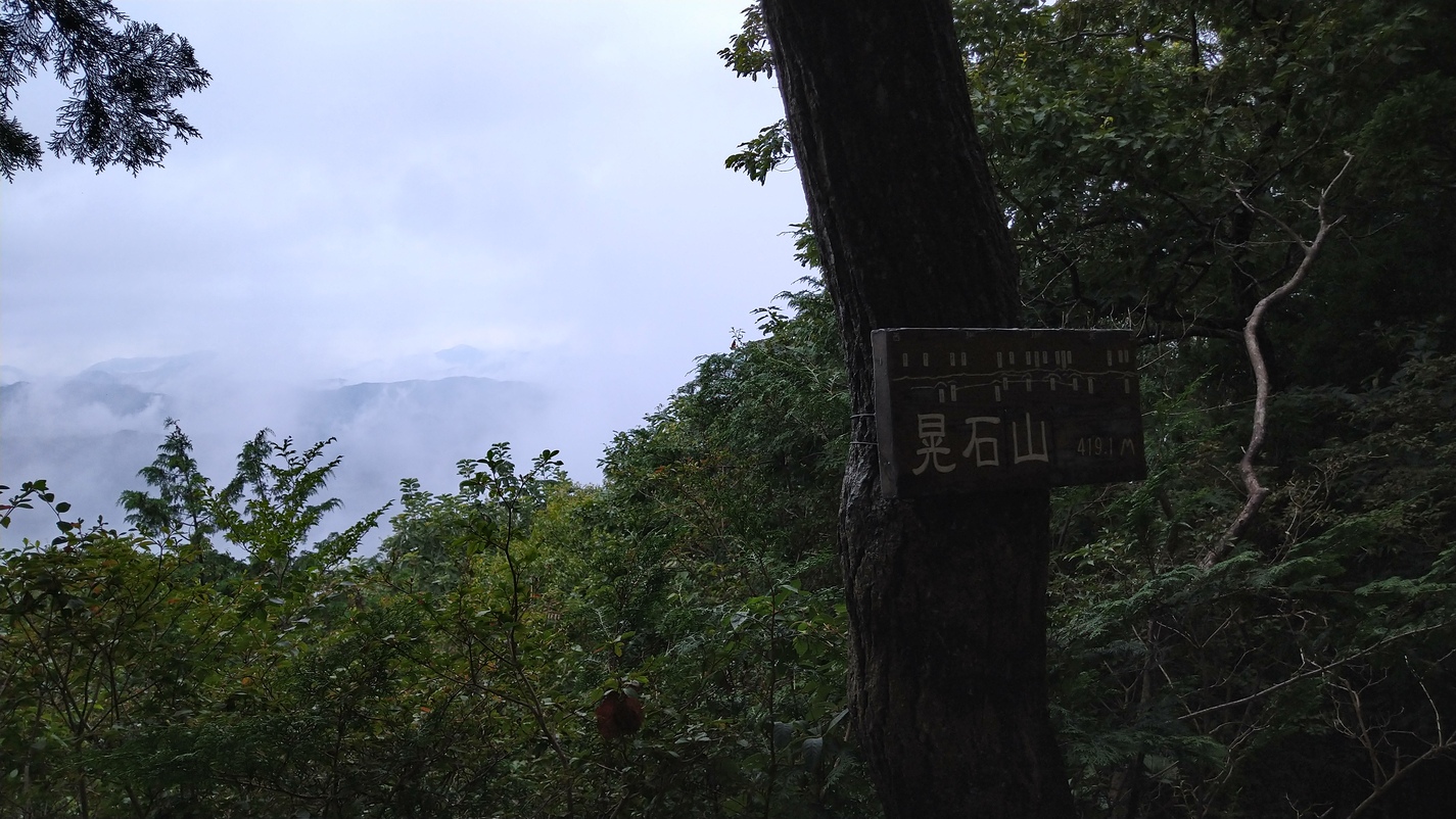 馬不入山へ向った途端に、人がいなくなり静かだ。さらに、霧が立ち込んで来れば物寂しく、人恋しくなる。馬不入山まで黙々と歩き、山頂で水だけ飲み、すぐに戻った。急いだ分、登り返しではペースダウンしてしまう。時間もギリギリだったが、もう一度晃石山に登った。帰路のぐみの木峠では、セミの声が響き渡っていた。カナカナと鳴く声は、いつまでも途切れる事無く、ヒグラシ達の輪唱のように聞こえた。そこに、アブラゼミが加わりアンサンブル!聞き入っているうち、だんだん遠ざかり太平山神社に着いた。