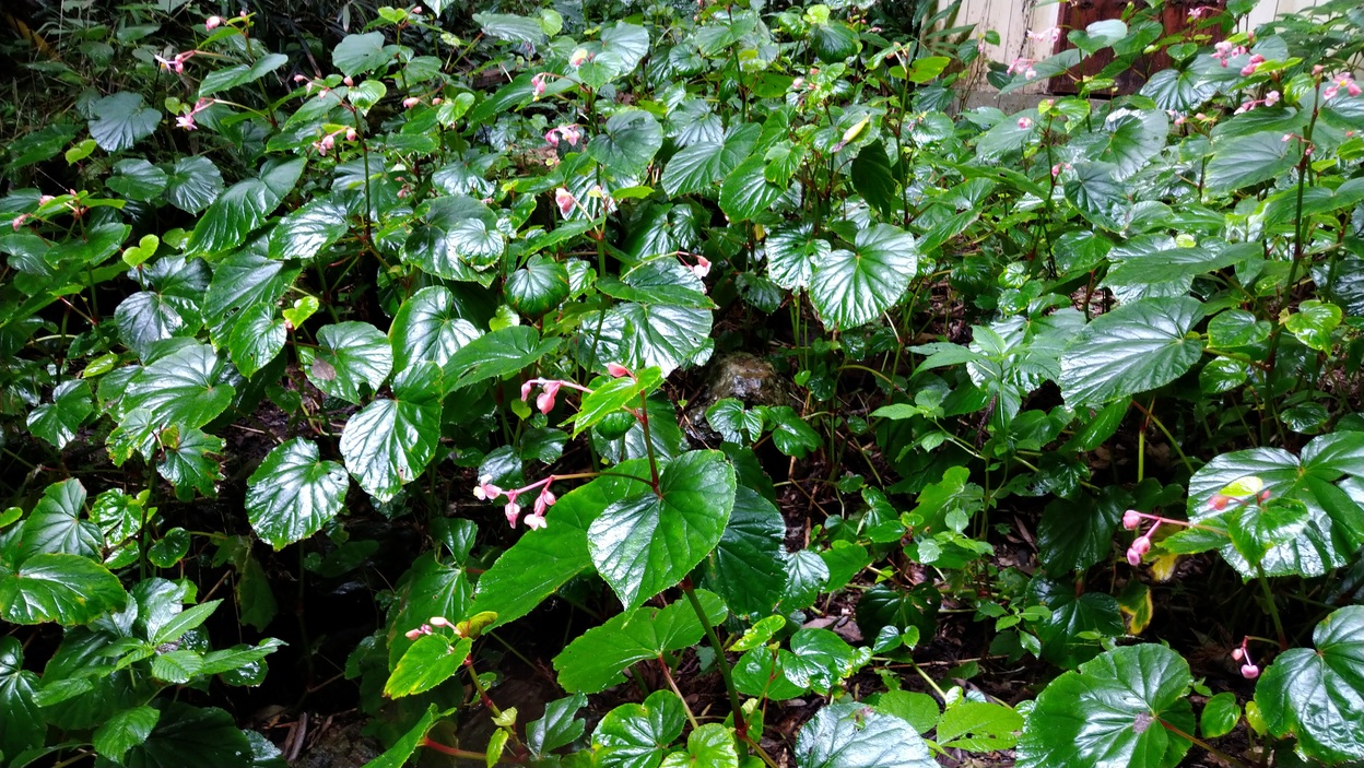 車を出ると、じっとしててもベトベトして来る蒸し暑さで、先が思いやられた。あじさい坂の花は皆茶色の塊に見え、ちょっと不気味な感じがしたが、そこを過ぎると、シュウカイドウが咲き始めていた。葉がツヤツヤとして生き生きしている。それだけでも美しい!階段に数本の木が倒れ、道を塞いでいた。2、3日前の凄い夕立でかな?