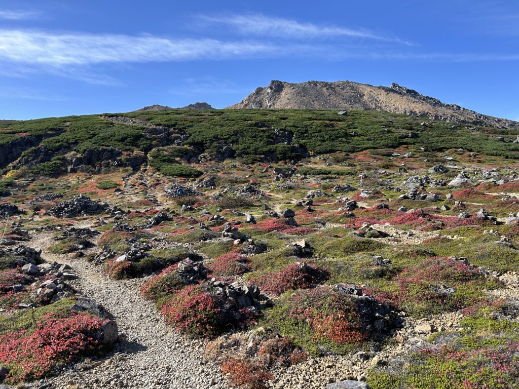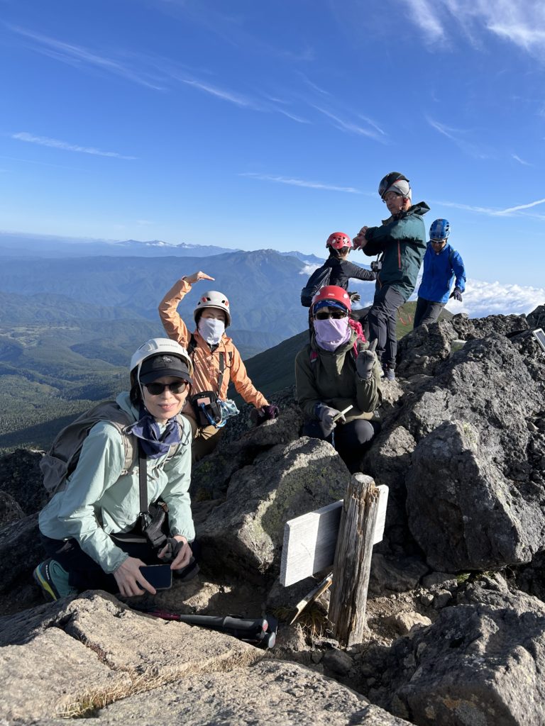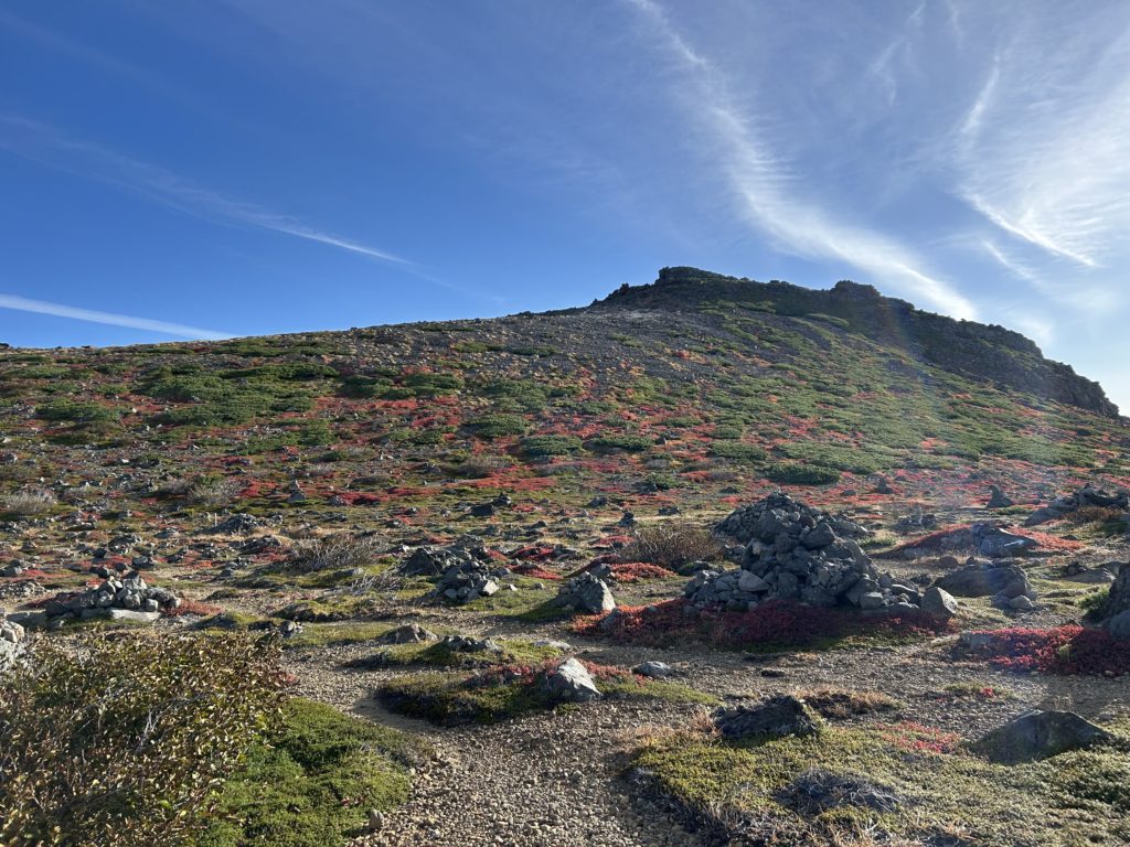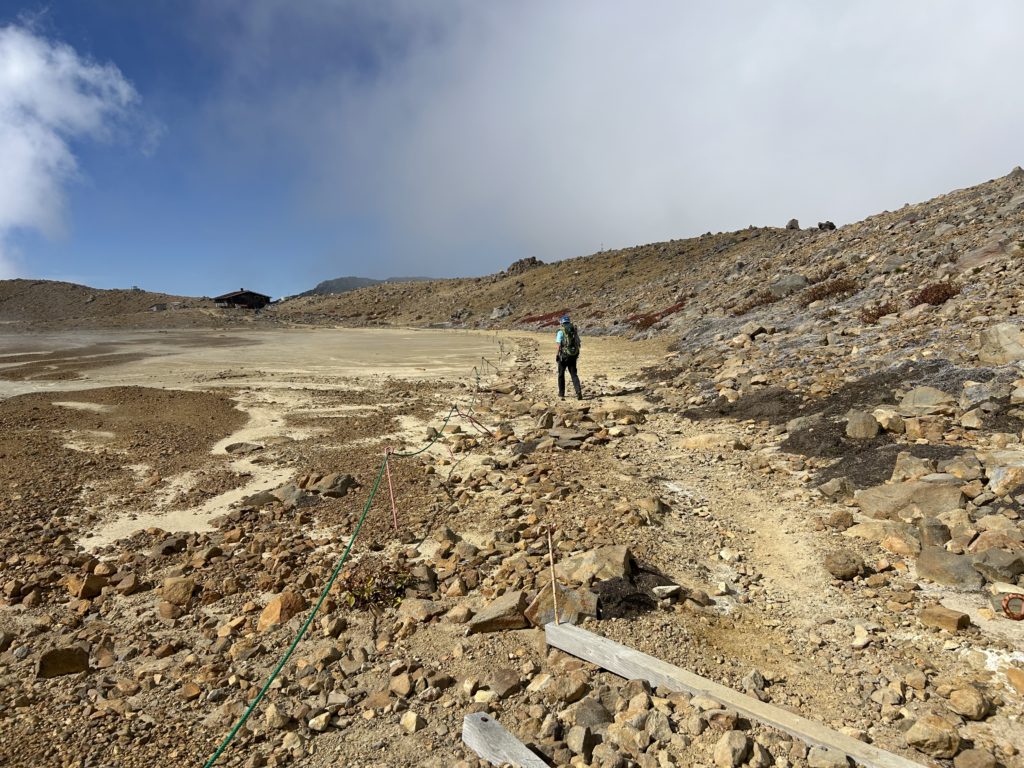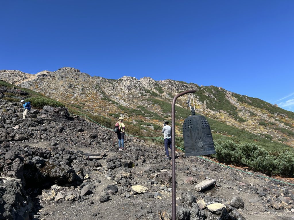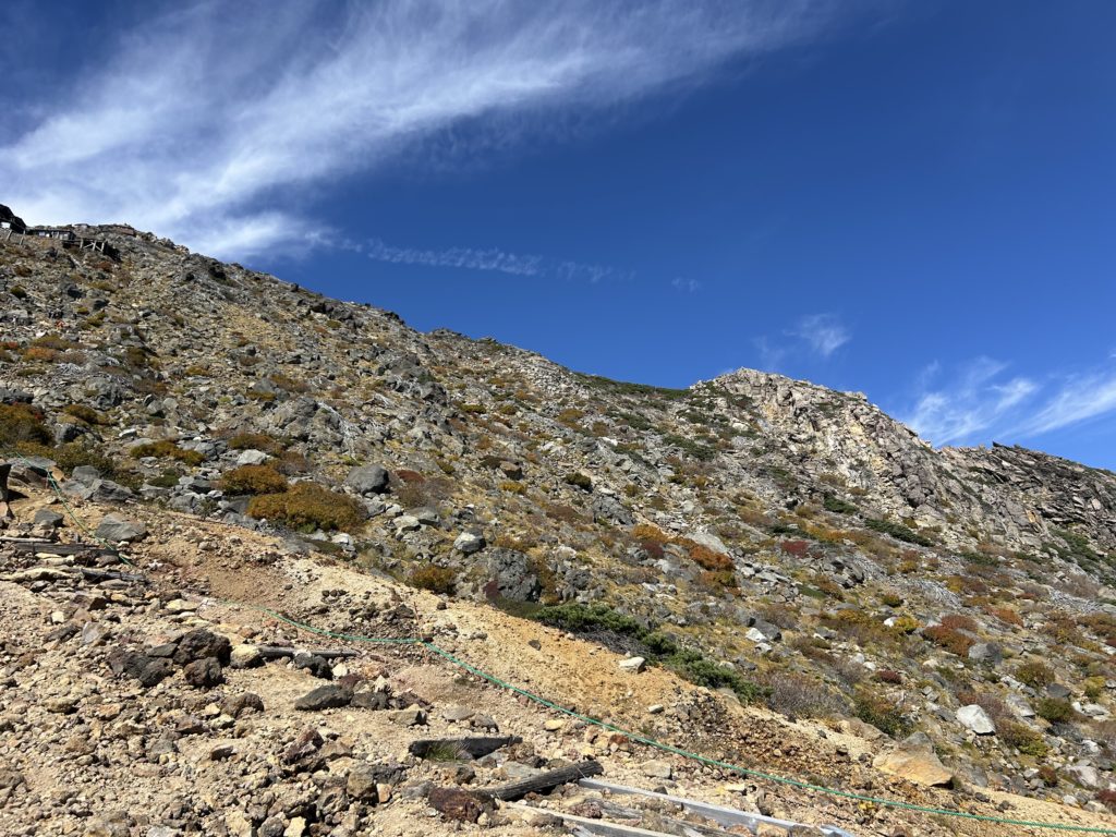 <詳細>登山口駐車場確保の関係で、開田キャンプ場を早めに(5:00)出発した。6:00頃には駐車場に到着したが、案の定、第一駐車場は満車、下段の駐車場は、余裕があったので安堵した。この時間帯に出発する登山者が少ない割には駐車している車が多い、前日からの入山者の車だろう。活火山なのでヘルメットは必須。支度を整え登山口を出発する時間には、下段の駐車場にも車が入りだした。登山口から少し歩いた所に鳥居があり、小さい祠が祭られていたので、登山の安全祈願をし、鳥居をくぐった。鳥居の上部を見上げると、少し雲はあるものの青空が見えたので、今後の天候に期待した。登山道は、多少朽ちた木道の階段が八合目辺りまで続く。前日が雨だったのか、朽ちた木道が滑りそうで神経を使った。御嶽山は古くから山岳信仰の対象であるため、この日も一名の白装束をまとった修験者が登っていた。七合目の行場山荘で、御岳ロープウェイ(鹿ノ瀬駅⇔飯森高原駅)を利用しての登山者と合流する。七合目を過ぎた2250m辺りから、登山道の木々が少しずつ色好き始めていた。2500m辺りまで来ると、ナナカマドの色鮮やかな赤が目を楽しませてくれた。八合目まで来る間に、十数名の登山者が私たちを追い越して行った。スタートから三時間、八合目女人堂に着いた。八合目からの眺望は素晴らしい!の一言に尽きる。正面に御岳山九合目、真下にハイマツの緑との赤と黄のパッチワークのような紅葉が見られその美しさに感動、八合目の展望所からは乗鞍岳、その奥に笠ヶ岳、右方面に目を移すと小さく槍ヶ岳、手前には穂高連峰と素晴らしい眺望を楽しめた。ここで、先行した修験者の方がほら貝を吹いていた。ここからの素晴らしい紅葉と山々の景色に大満足だった。八合目から先は、岩場と木道のミックスとなり、ハイマツ地帯を過ぎるとガレ場となり九合目の石室山荘まで慎重に進みました。途中振り向くと、眼下に女人堂、遠くには中央アルプス、南アルプス、そして薄っすらと富士山も望め、最高の景色だ。石室山荘から先どうやって進むのかと思っていたら、なんと石室山荘の中を通り抜け進むのだそう、驚いた。石室山荘を通り抜けると一気に火山の様相を呈して来た。ヘルメットが必須のエリヤだ。11:52に九合目覚明堂に着くと、遠方から放送音が聞こえてきた。何の放送だろうと聞き耳を立てると、2014年9月27日11:52木曾御岳山が噴火した時間のお知らせ放送、ご冥福をお祈りし黙禱。傍に腰掛けておられた登山者の方が、御岳山頂上では慰霊に訪れている方々や新聞記者の方が来ていると、そして覚明堂傍の宿泊施設の屋根に、沢山の噴石が飛んで来た為閉鎖したと詳しく説明してくれた。あれからもう11年が経過したのか時の流れの速さに驚きを感じた。ここから分岐まであとわずか、気を抜かないように進み、分岐から剣ヶ峯方面に向かう。剣ヶ峯頂上直下に3基の避難シェルターと死者58名、行方不明者5名の方々のお名前と噴火日時が刻まれた噴火災害慰霊碑が設置されていて追悼の気持ちを込め手を合わせる。ここから剣ヶ峯頂上に行くために立派な石の階段を上り、鳥居をくぐり抜け山頂に!山頂では写真撮りに順番待ちでした。頂上までの規制緩和(平成7年7月~10月12日)の御嶽山、今回の山行に参加させて頂けたことに感謝し、今日の宿泊先の二ノ池山に向かった。二ノ池山荘前にある観光名所二ノ池は、山頂直下に位置し、日本最高所の池として知られていたそうだが、噴火の灰が流れ込み平成26年の御嶽山大噴火で火山灰や土砂が流れ込み、雨や雪解け水で完全に消滅し、二ノ池本館にも大量の火山灰が降りそそいだそうで、新たに二ノ池山荘が建てられたそう。営業に至るまでのご苦労を思うと宿泊できることっを有難く思った。二ノ池山荘のスタッフの方の対応が親切で、とても気持ちが良かった。(一泊二日料金・13,000円)二ノ池山荘の売店には噴火時の噴石が置かれていて実際に手を触れてみてと記載があったので持ち上げて見ました。こんなに重たい噴石が直撃したのかと、活火山の怖さを感じ取りました。27日の宿泊者は60名ほど、ツアー客が半数を占めていた。翌朝、日の出見るために小屋裏手の展望所に行き、奇麗な日の出を見ることが出来ました。28日はザックを二ノ池山荘にデポさせてもらい、二ノ池ヒュッテを経由し賽の河原に下った。賽の河原から摩利支天山を望むと、強大な花崗岩の岩峰がそびえている。御嶽山の賽の河原も独特の雰囲気が漂う場所だ。賽の河原から白滝避難小屋まで一登り、避難小屋稜線からのコバルトブルーの美しい三の池が望めた。摩利支天山頂まではどのような道なのだろうと不安に思いながら進むと、岸壁の下に幅は狭いが、はっきりとしたルートがあり、岩場の足元に注意しながら進んだ。幸いにも登山者が少なく、すれ違いや岩場の登りにも時間がかからずラッキーだった。摩利支天山の山頂はかなり狭い、先行者が一名いたので、その方にメ
