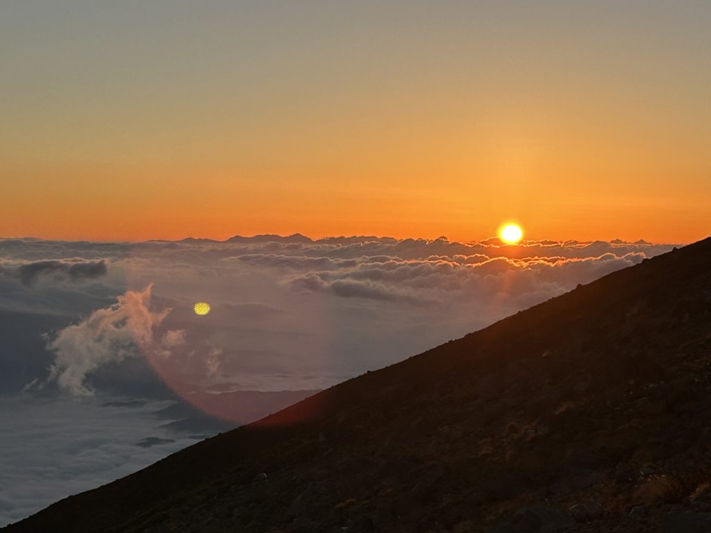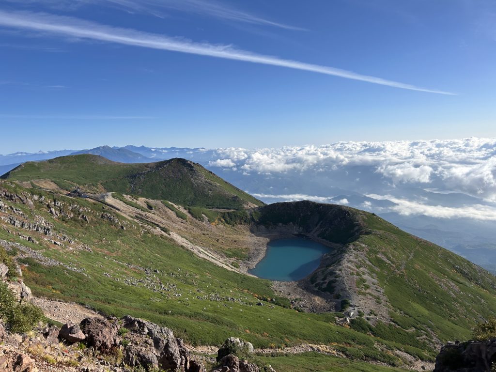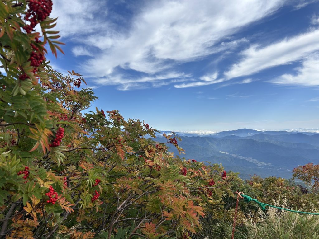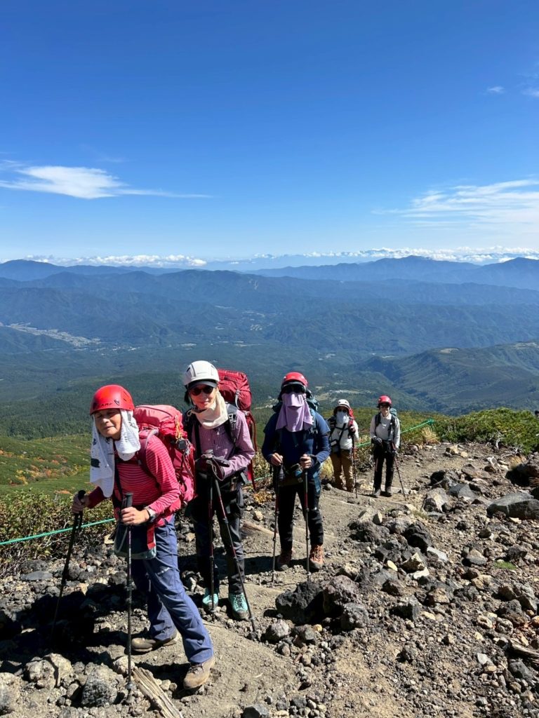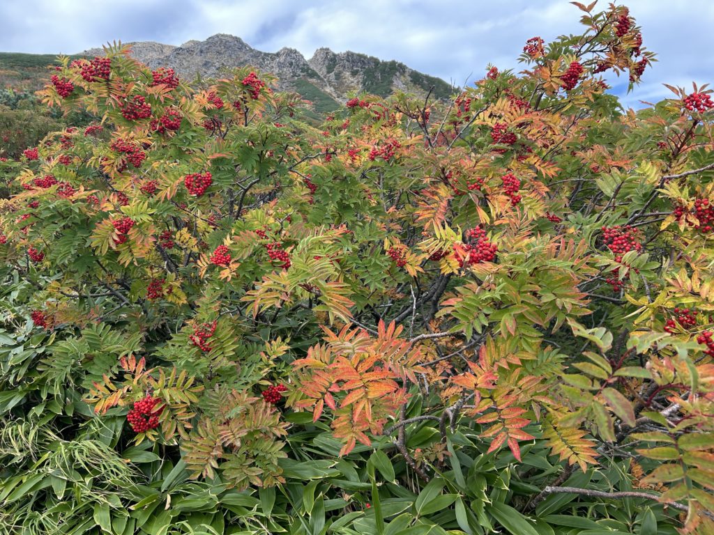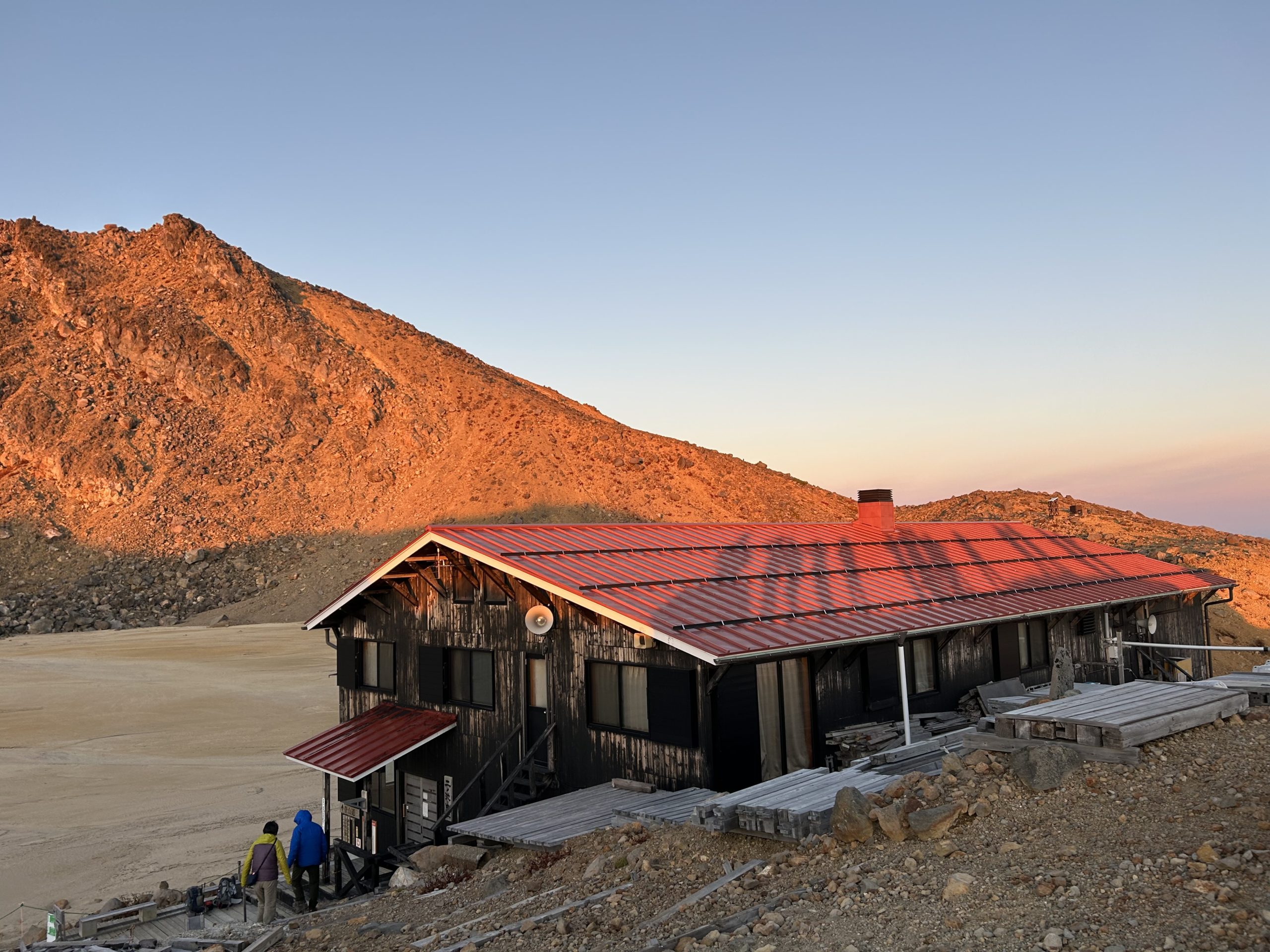 <詳細>登山口駐車場確保の関係で、開田キャンプ場を早めに(5:00)出発した。6:00頃には駐車場に到着したが、案の定、第一駐車場は満車、下段の駐車場は、余裕があったので安堵した。この時間帯に出発する登山者が少ない割には駐車している車が多い、前日からの入山者の車だろう。活火山なのでヘルメットは必須。支度を整え登山口を出発する時間には、下段の駐車場にも車が入りだした。登山口から少し歩いた所に鳥居があり、小さい祠が祭られていたので、登山の安全祈願をし、鳥居をくぐった。鳥居の上部を見上げると、少し雲はあるものの青空が見えたので、今後の天候に期待した。登山道は、多少朽ちた木道の階段が八合目辺りまで続く。前日が雨だったのか、朽ちた木道が滑りそうで神経を使った。御嶽山は古くから山岳信仰の対象であるため、この日も一名の白装束をまとった修験者が登っていた。七合目の行場山荘で、御岳ロープウェイ(鹿ノ瀬駅⇔飯森高原駅)を利用しての登山者と合流する。七合目を過ぎた2250m辺りから、登山道の木々が少しずつ色好き始めていた。2500m辺りまで来ると、ナナカマドの色鮮やかな赤が目を楽しませてくれた。八合目まで来る間に、十数名の登山者が私たちを追い越して行った。スタートから三時間、八合目女人堂に着いた。八合目からの眺望は素晴らしい!の一言に尽きる。正面に御岳山九合目、真下にハイマツの緑との赤と黄のパッチワークのような紅葉が見られその美しさに感動、八合目の展望所からは乗鞍岳、その奥に笠ヶ岳、右方面に目を移すと小さく槍ヶ岳、手前には穂高連峰と素晴らしい眺望を楽しめた。ここで、先行した修験者の方がほら貝を吹いていた。ここからの素晴らしい紅葉と山々の景色に大満足だった。八合目から先は、岩場と木道のミックスとなり、ハイマツ地帯を過ぎるとガレ場となり九合目の石室山荘まで慎重に進みました。途中振り向くと、眼下に女人堂、遠くには中央アルプス、南アルプス、そして薄っすらと富士山も望め、最高の景色だ。石室山荘から先どうやって進むのかと思っていたら、なんと石室山荘の中を通り抜け進むのだそう、驚いた。石室山荘を通り抜けると一気に火山の様相を呈して来た。ヘルメットが必須のエリヤだ。11:52に九合目覚明堂に着くと、遠方から放送音が聞こえてきた。何の放送だろうと聞き耳を立てると、2014年9月27日11:52木曾御岳山が噴火した時間のお知らせ放送、ご冥福をお祈りし黙禱。傍に腰掛けておられた登山者の方が、御岳山頂上では慰霊に訪れている方々や新聞記者の方が来ていると、そして覚明堂傍の宿泊施設の屋根に、沢山の噴石が飛んで来た為閉鎖したと詳しく説明してくれた。あれからもう11年が経過したのか時の流れの速さに驚きを感じた。ここから分岐まであとわずか、気を抜かないように進み、分岐から剣ヶ峯方面に向かう。剣ヶ峯頂上直下に3基の避難シェルターと死者58名、行方不明者5名の方々のお名前と噴火日時が刻まれた噴火災害慰霊碑が設置されていて追悼の気持ちを込め手を合わせる。ここから剣ヶ峯頂上に行くために立派な石の階段を上り、鳥居をくぐり抜け山頂に!山頂では写真撮りに順番待ちでした。頂上までの規制緩和(平成7年7月~10月12日)の御嶽山、今回の山行に参加させて頂けたことに感謝し、今日の宿泊先の二ノ池山に向かった。二ノ池山荘前にある観光名所二ノ池は、山頂直下に位置し、日本最高所の池として知られていたそうだが、噴火の灰が流れ込み平成26年の御嶽山大噴火で火山灰や土砂が流れ込み、雨や雪解け水で完全に消滅し、二ノ池本館にも大量の火山灰が降りそそいだそうで、新たに二ノ池山荘が建てられたそう。営業に至るまでのご苦労を思うと宿泊できることっを有難く思った。二ノ池山荘のスタッフの方の対応が親切で、とても気持ちが良かった。(一泊二日料金・13,000円)二ノ池山荘の売店には噴火時の噴石が置かれていて実際に手を触れてみてと記載があったので持ち上げて見ました。こんなに重たい噴石が直撃したのかと、活火山の怖さを感じ取りました。27日の宿泊者は60名ほど、ツアー客が半数を占めていた。翌朝、日の出見るために小屋裏手の展望所に行き、奇麗な日の出を見ることが出来ました。28日はザックを二ノ池山荘にデポさせてもらい、二ノ池ヒュッテを経由し賽の河原に下った。賽の河原から摩利支天山を望むと、強大な花崗岩の岩峰がそびえている。御嶽山の賽の河原も独特の雰囲気が漂う場所だ。賽の河原から白滝避難小屋まで一登り、避難小屋稜線からのコバルトブルーの美しい三の池が望めた。摩利支天山頂まではどのような道なのだろうと不安に思いながら進むと、岸壁の下に幅は狭いが、はっきりとしたルートがあり、岩場の足元に注意しながら進んだ。幸いにも登山者が少なく、すれ違いや岩場の登りにも時間がかからずラッキーだった。摩利支天山の山頂はかなり狭い、先行者が一名いたので、その方にメ