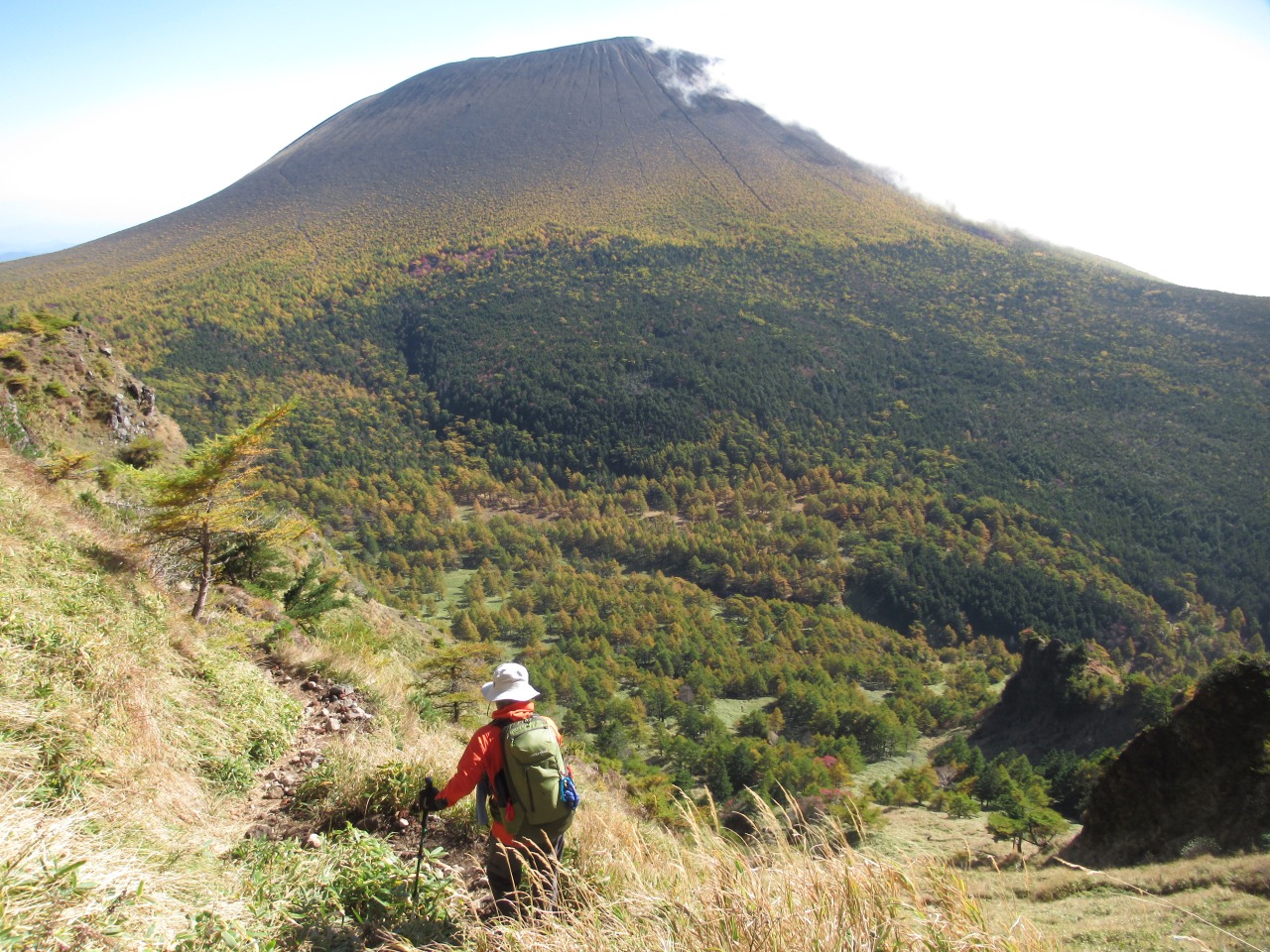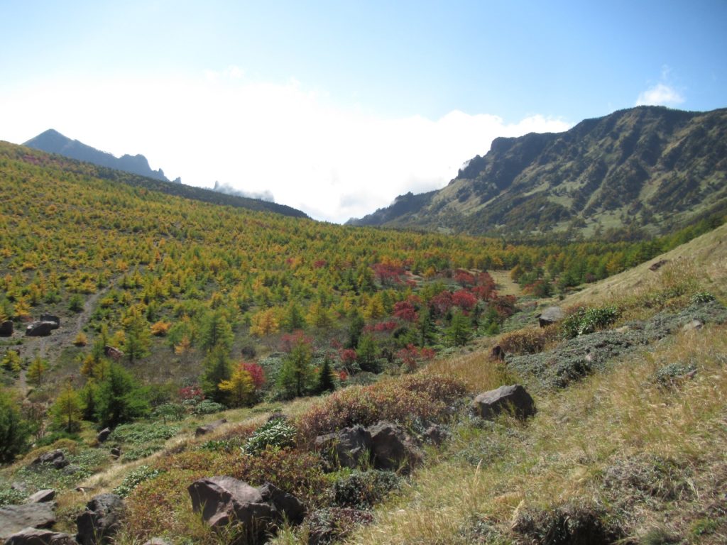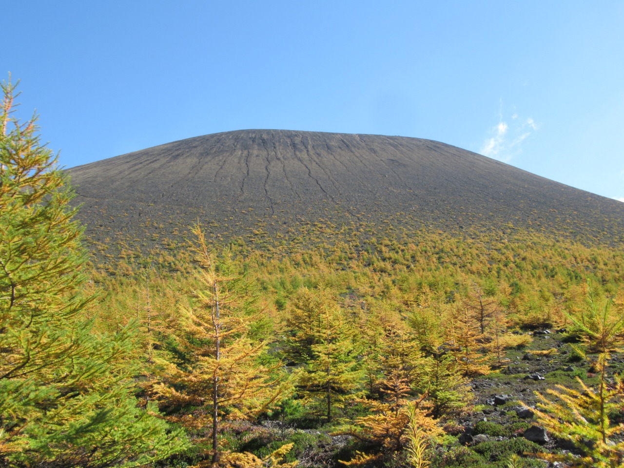 湯の平口分岐から、せっかくなので火山館に立ち寄り小休止、湯の平の金色のカラマツ、真っ赤なナナカマド、時折カラマツ越しに見える荒々しい外輪山や、なだらかで雄大な浅間の景観がずっと目を楽しませてくれました。
