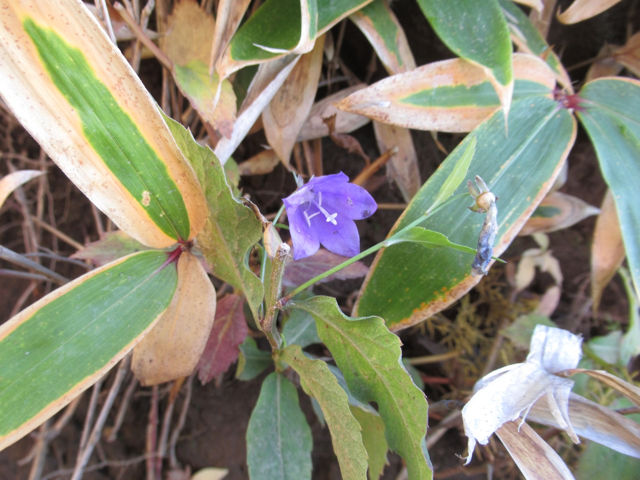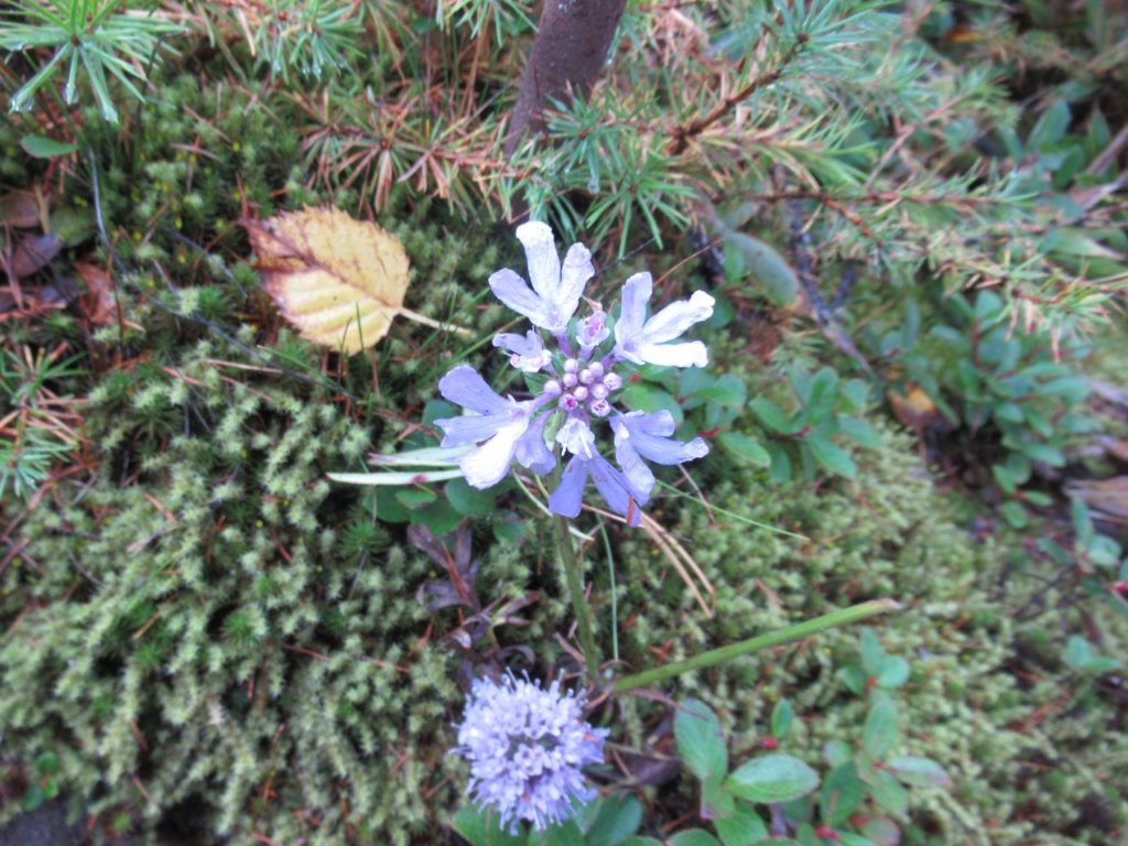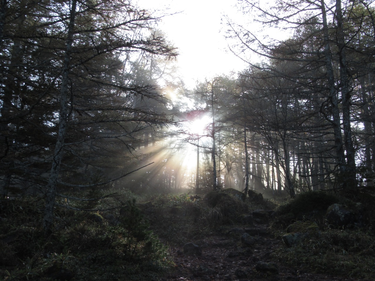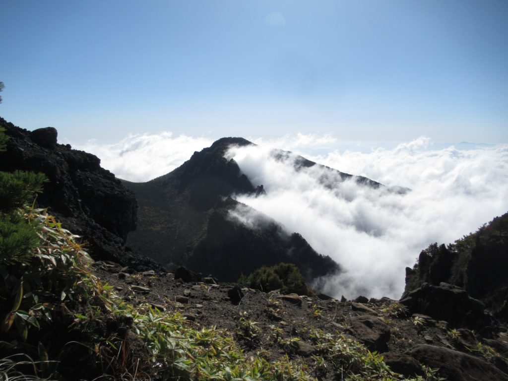気温6℃で肌寒く厚めのアウターを着て出発、昨夜の雨の影響か霧が少し出て曙光が綺麗に輝き、登山道傍らには、マツムシソウ、ハナゴケ、シャジンが過行く季節の名残を感じさせます。槍ケ鞘からは、南の佐久方面は剣ケ峰に掛かる雲海が何とも幻想的、浅間はカラマツが黄金色に色づきスッキリと臨めます。トーミの頭でもう一度景観を楽しみ少し先の分岐を湯の平方面に、草スベリの急坂を下りますが、ジグが切られているものの急で神経を使います。