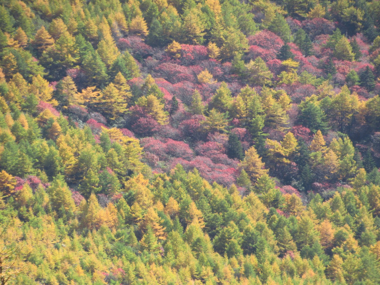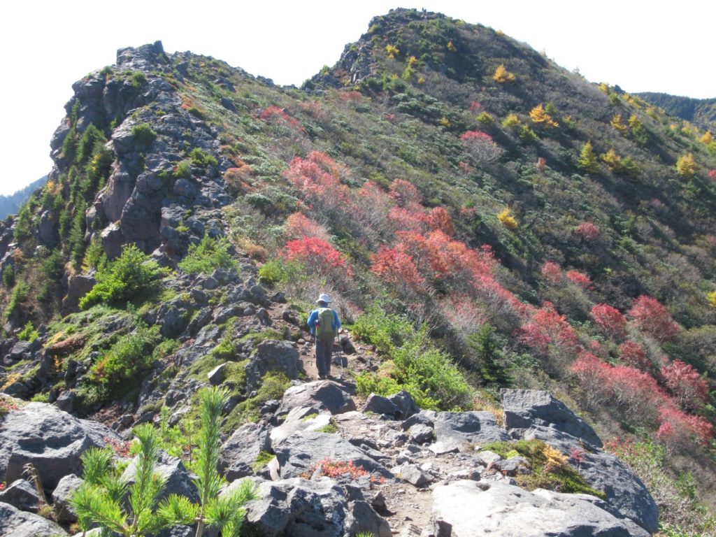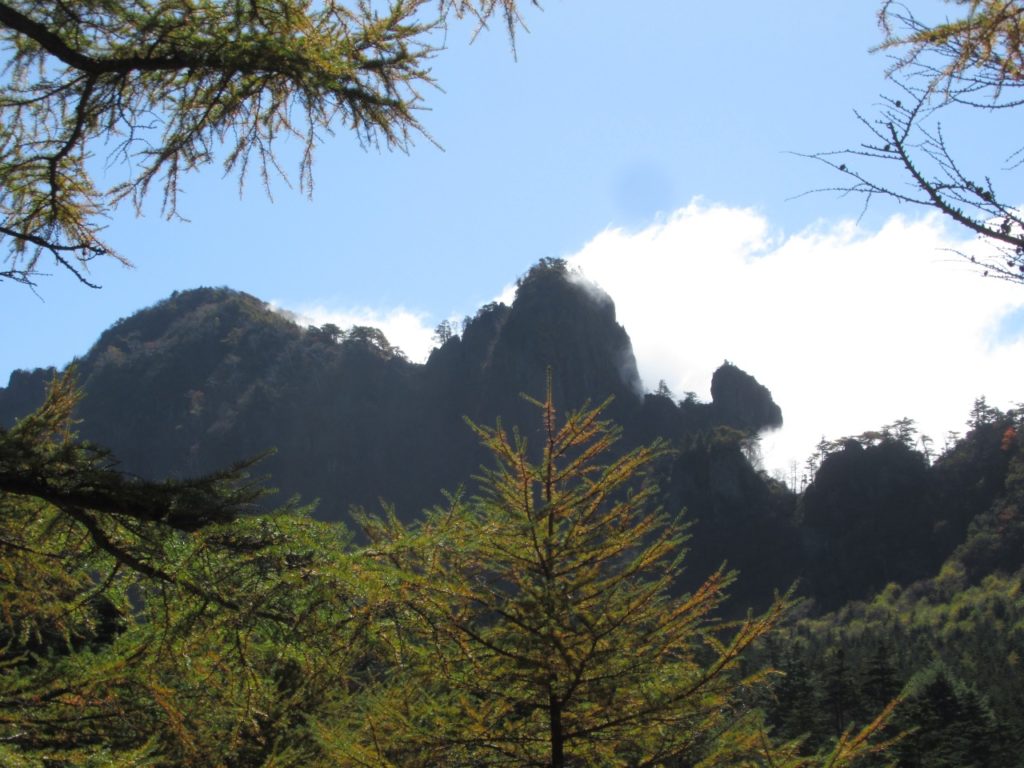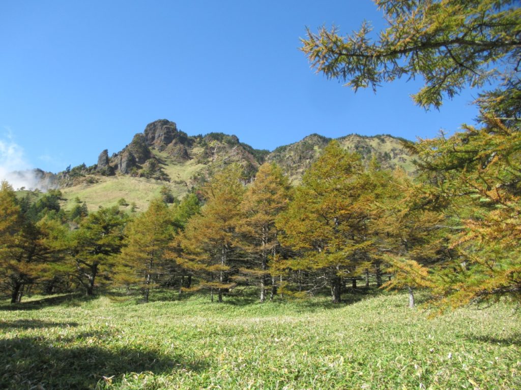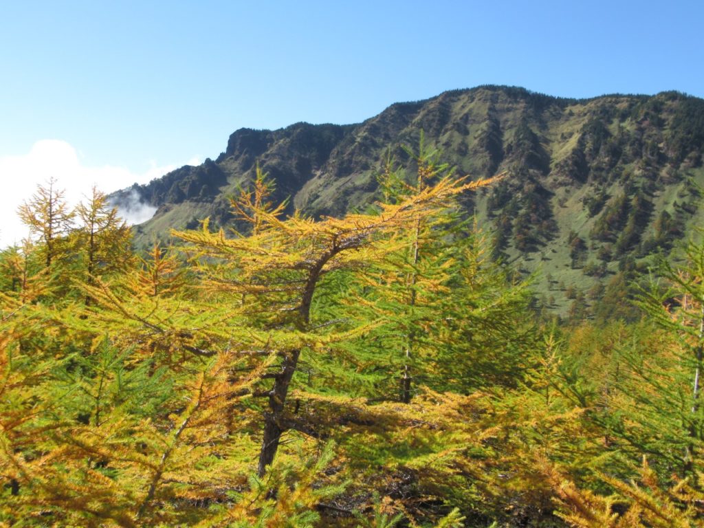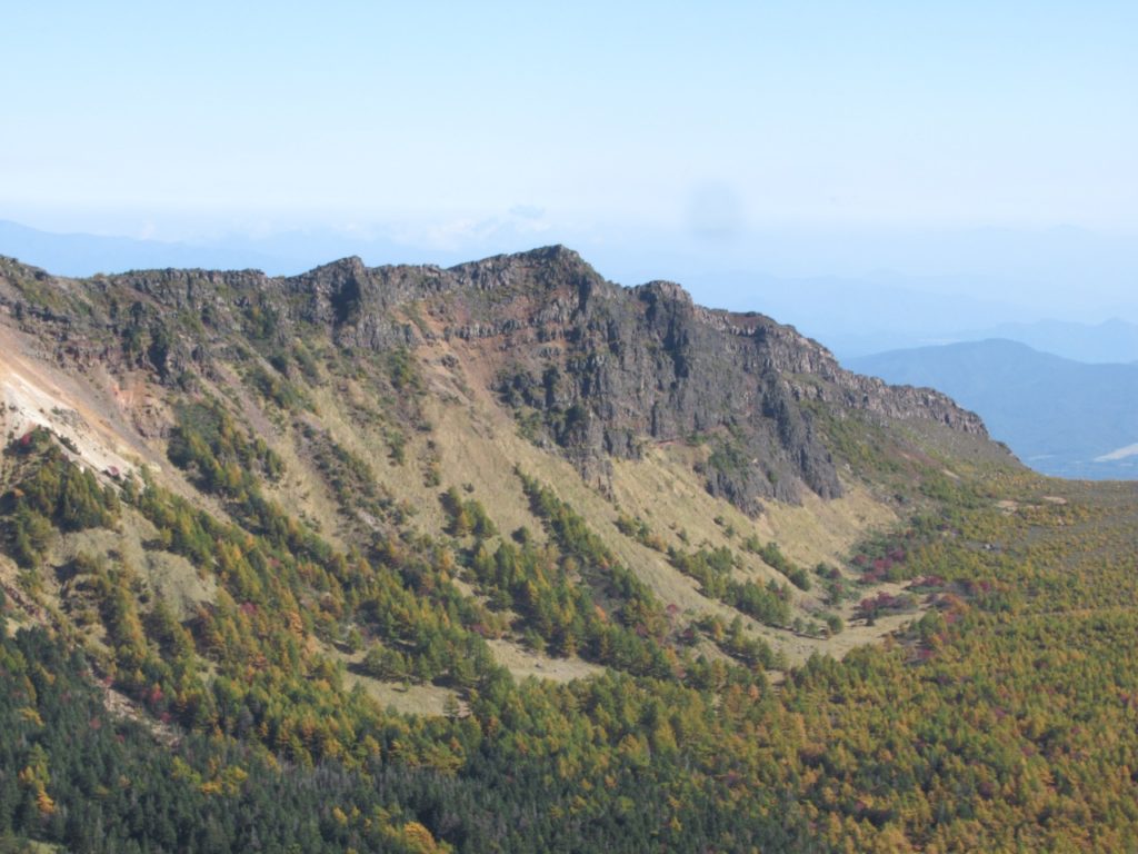 さてJバンドを見上げると大きく立ちはだかる急峻な大岩壁、一体どうやって登るのだろうと思いながら歩を進めると足場のしっかりしたガレ場のトラバース路が切られ、ほっとする。途中、湯の平のどこまでも続く金色のカラマツ林を眺め稜線に出た。鋸岳から仙人岳、蛇骨岳に続く外輪山上の登山路はガレていますが視界を遮るものが無く景観が良い。仙人岳で大休止しましたが、下の湯の平に熊の親子が徘徊しているのを目撃、その話をしていた時突然咳込んでしまい、何事かと振り向くと、若者が熊撃退スプレーの試し噴射をしていたのでした。一言謝りその場を立ち去りましたが非常識な人がいるものだと憤慨しました。