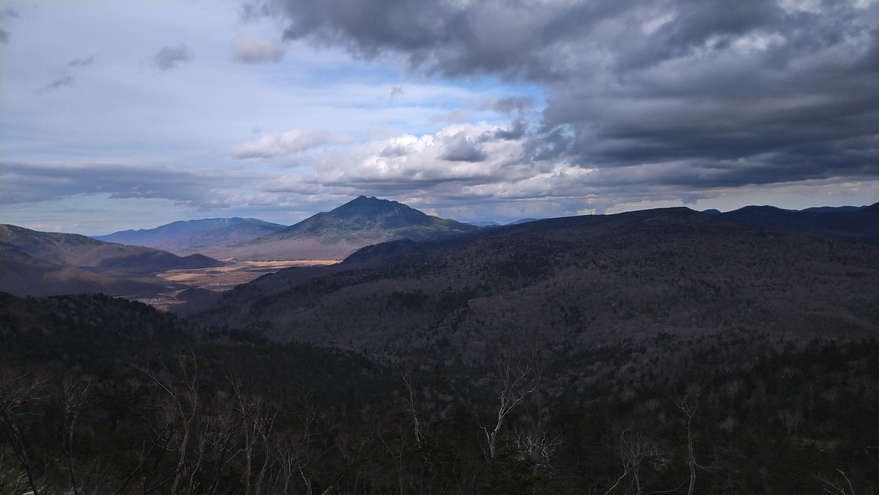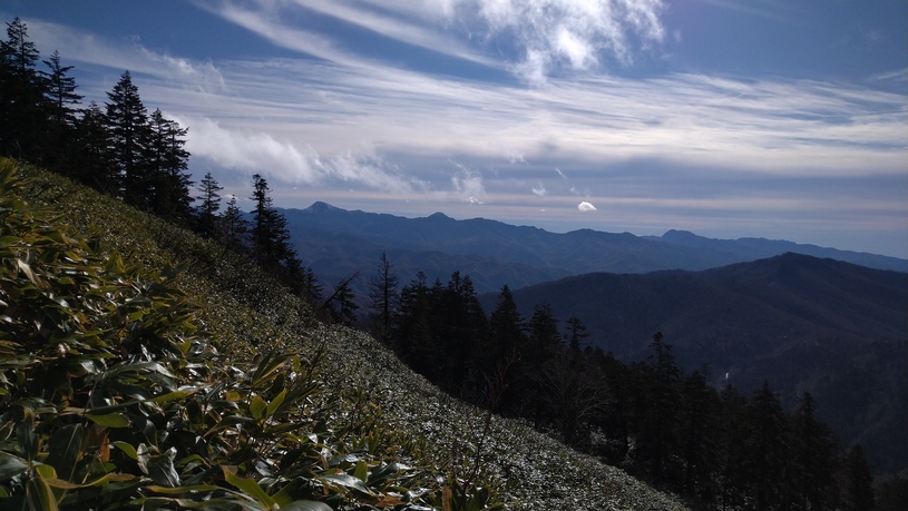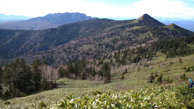 ぬかるみと足元の見えずらい笹薮で、靴とスパッツは泥だらけ。しかし、樹林をぬけると斜面一杯の笹原や、ぬかるみを脱出して広がる開放的な景色は素晴らしかった。行く先には、小笠と笠ヶ岳の姿がとても美しい。日光白根山、錫ヶ岳、皇海山の山並みも見える。このワクワク気分もつかの間、更なる劣悪の道となり、間違えて踏み入れてしまうと、足首までズブズブ沈み、抜く時はシュポッと音がする。そんな事を何度もやると、そのうち開き直り、泥も滑りも笑って吹き飛ばしてしまうのだ。