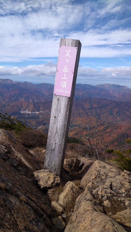 笠ヶ岳山頂分岐からは岩と、ざれた急斜面で、石を落とさぬよう気お付けて登るので結構きつい。山頂からは、錦のじゅうたんの山々と眺望の山々の眺めは、実に壮観でした。谷川岳、その奥のなだらかな苗場山、右に巻機山や越後駒ヶ岳、中ノ岳など教えてもらいながら、360度バッチリの景色を楽しんだ。風があり寒いので食事をしないで下山し、片藤沼まで行ってみた。静まり返った沼は神秘的である。帰りの登り返しを見ながら、「笠ヶ岳と悪沢岳分岐の標高は、ほぼ同じなんだよな-」など話す。
