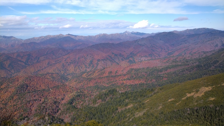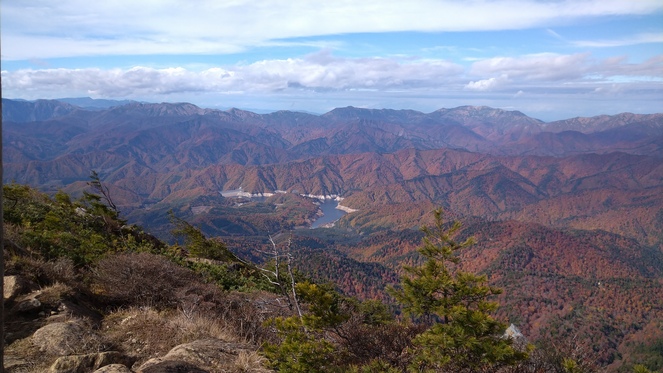 <概要>劣悪な登山道が、この山を遠ざけているのか、静寂に包まれています。だからこそ景色が一層美しく見え、しみじみと山を楽しむことが出来ました。難儀をしてたどり着いた山頂は、見事な紅葉と眺望で感動しました。