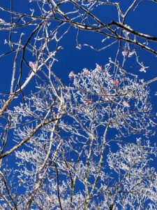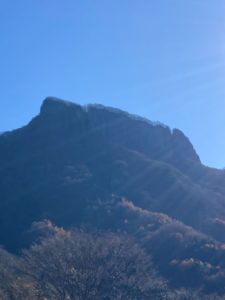 <詳細報告>荒船山は、クレヨンしんちゃんの作者が亡くなった場所でどのようなところかと思っていた。車からみえる荒船山は、天気がよいにもかかわらずテーブルマウンテンのトップは雲に覆われていた。映画のロストワールドのような雰囲気。8時に内山峠に着くと、数台止める場所が空いていた。内山峠駐車場の奥の登山道から登り始める。入口に行方不明者の掲示版があり、どんなところなのかと更に不安になる。登山口は、斜面に作られた細い道から始まる。風が強く、寒さを感じる。登山道は、道は狭く、ところどころ切れ込んでいるが、急登はなく登りやすい。ところどころに鎖場はあるが、鎖をつかむほどでもない。最後の登りをあがると50年は立っていそうな、みんなで楽しむハイキングコースの看板がみえた。艫岩に着くと確かに切れ込んでいる。崖の直前まで平で木も生えている。確かに不用意に近づくと危険かもしれないと感じた。ここからほぼフラットな荒船山に最高地点に向かう。ガスも抜けてきて青空が見える。周囲の木には、霧氷がついており綺麗だ。山頂は、経塚山の看板もありここは、荒船山か経塚山かどちらが正しいのだろうと思う。山頂に着く頃には、気温も上がり始め、周囲の霧氷がバラバラと落ち始めた。塊で落ちるので当たると痛い。行きは、幻想的は景色だったが、帰りは、別のコースのように明るい道に変わっていた。