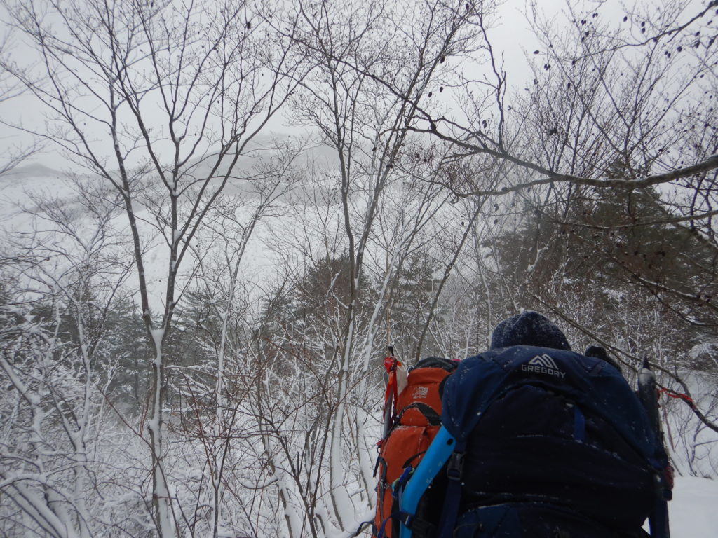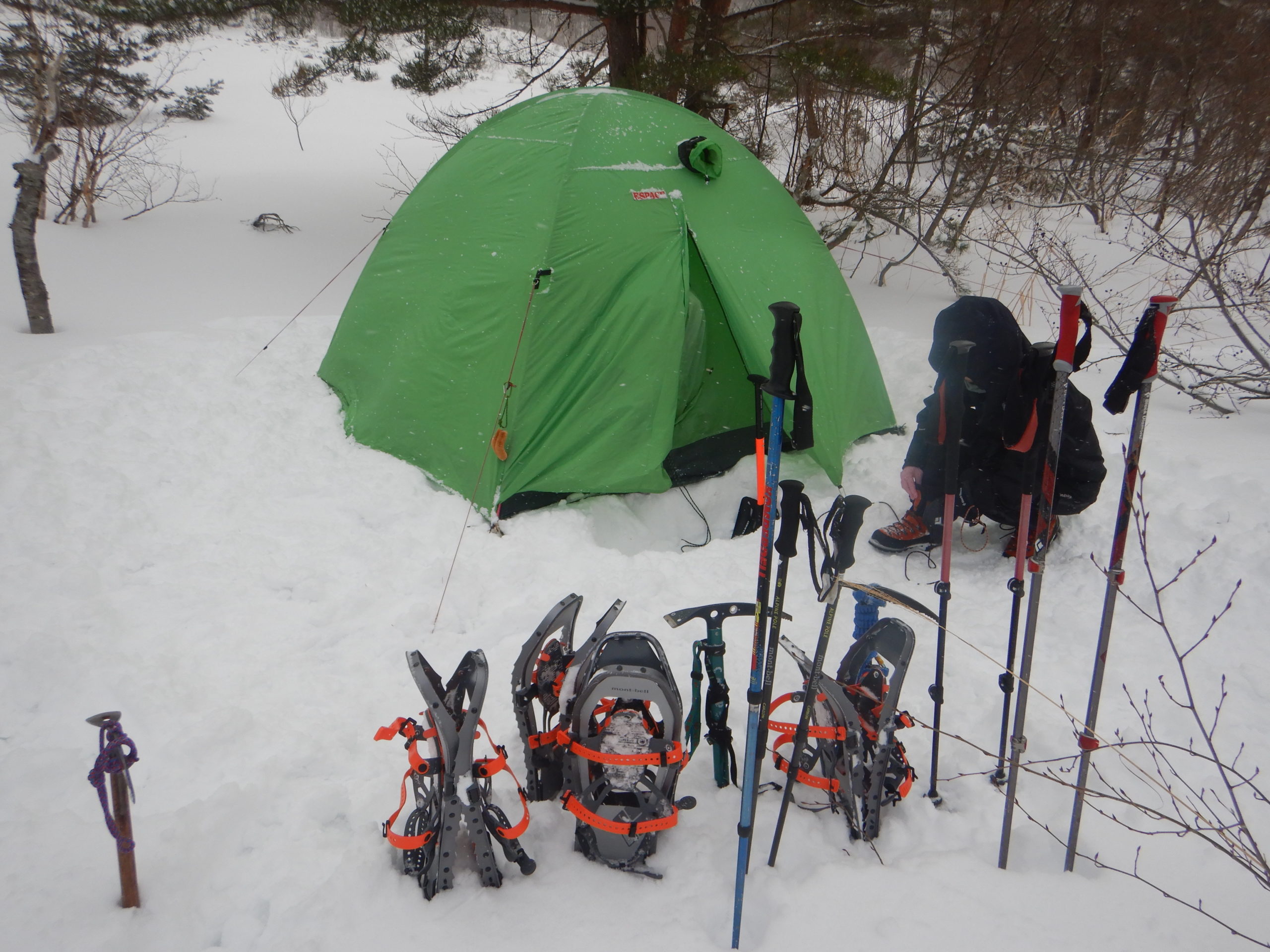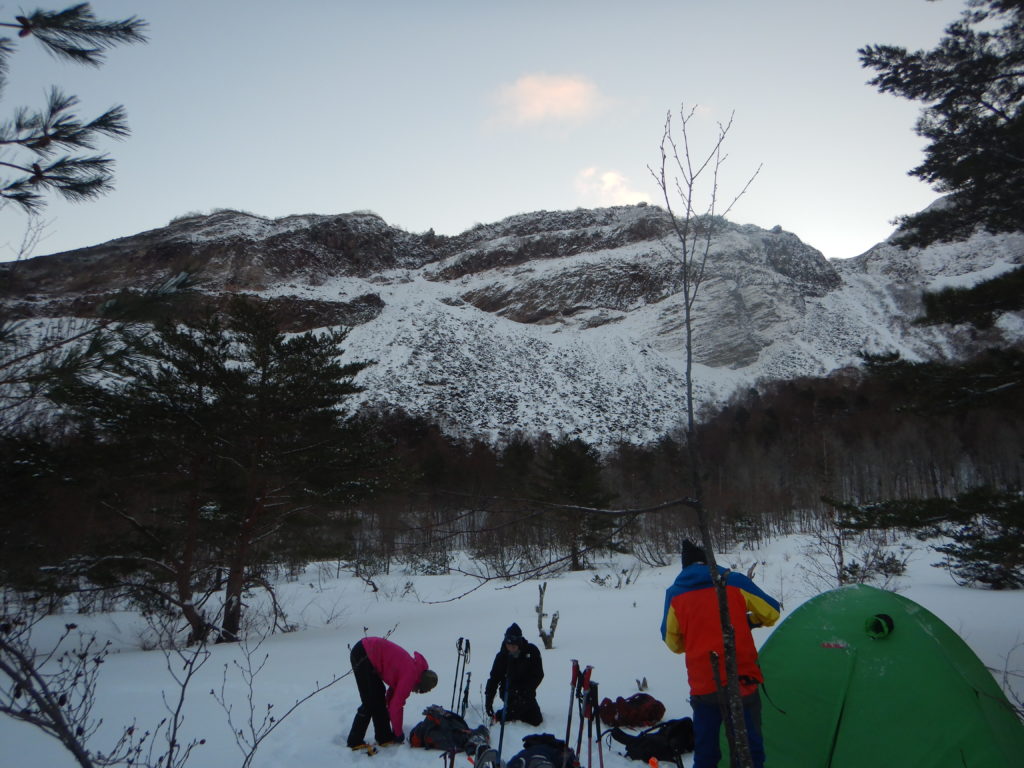 昨日の天候は雪と強風の予報で、この日もその影響が残ることを予測して、最初予定していた弘法清水のテント設営を、風の影響が少ないイエローホール付近に変更、再計画しての初日でした。