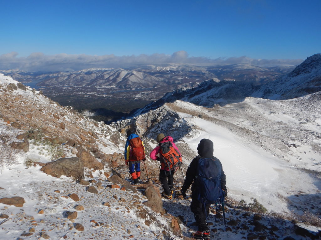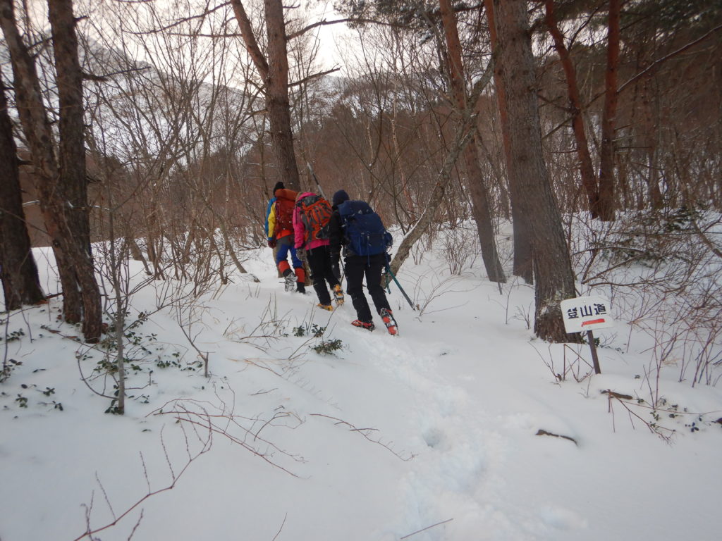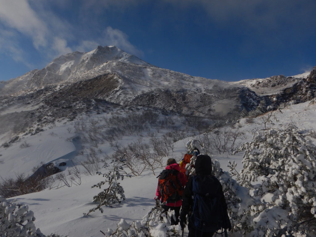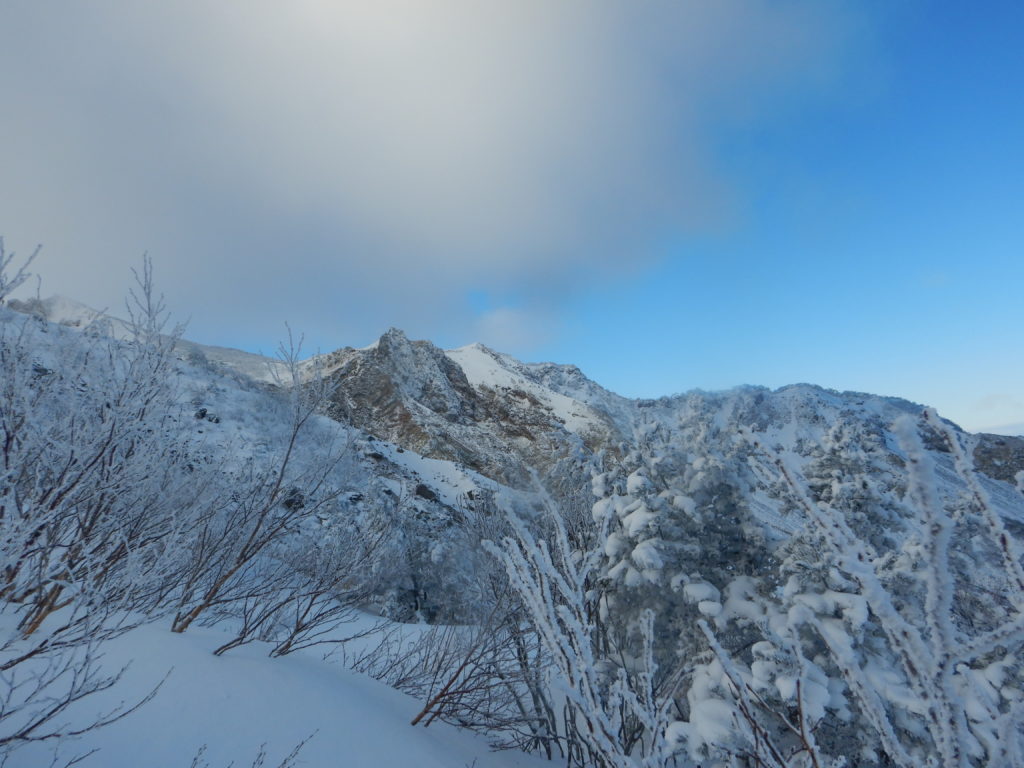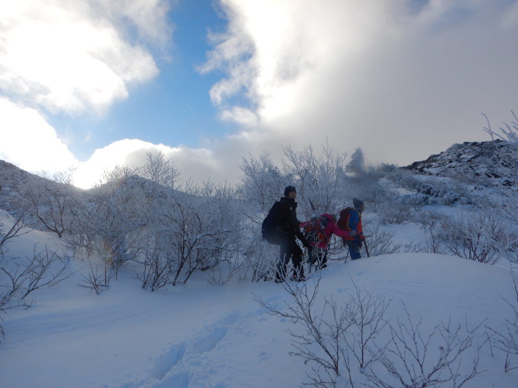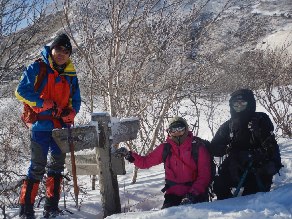 夕食の豚汁定食で身体が温まったのか、昨夜はシュラフに入るとすぐに寝てしまいました。今朝はその残りで雑炊を作り、お腹を満たしました。登頂したあと、戻ったときに一休みをとるため、テントはそのままにしておき、最小限の装備とアイゼン、ピッケルで出発しました。雪が付いたガレ場の噴気口は歩きにくく、それがすぐ落葉松の樹林帯に入ると岩の歩きにくさは解消されましたが、時折雪の空洞に足を取られて、また違い歩きにくさがありました。しばらくこの尾根道に沿って高度を上げていきました。出発前にヤマレコで現地情報を確認しても、入山者の情報が得られなかったように、いざ現地に来てみて分かったことは、入山者が少ないため夏道にトレースが無く、あっても雪で埋まっていたのかもしれませんが、積雪の樹林は一部やぶだったりして、私たちの入山を拒んでいるようでした。高度を上げていき、斜面が急登になると、登山道の両脇に、鉄の棒をU字に曲げた手すりが稜線近くまで設置されていて、それをつかみながら登っていきました。