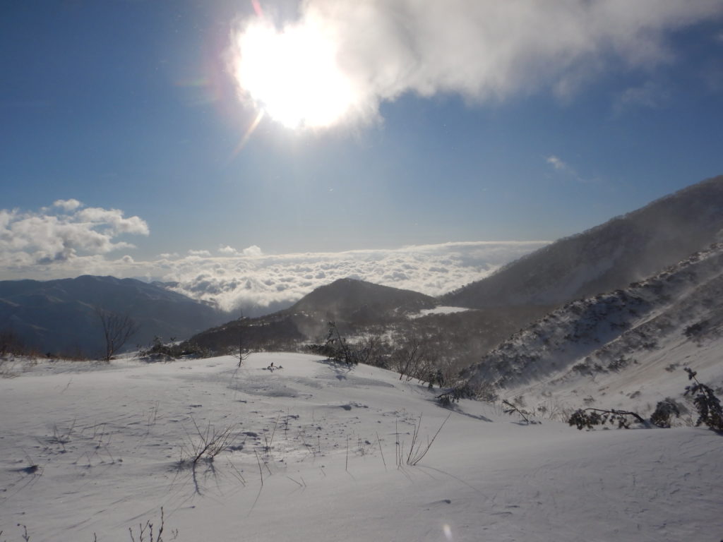 12/28晴れ テント場7:10~8:48櫛ヶ峰分岐(1450m)~9:05三合目分岐(1491m)~9:10登頂断念(1493m)~三合目分岐~9:45櫛ヶ峰分岐~10:17テント場11:47~12:19ゲレンデ噴気口登山口~12:46裏磐梯スキー場P-14:20裏磐梯レイクリゾート(入浴)-猪苗代IC-宇都宮IC-16:00長岡百穴P-16:40下野