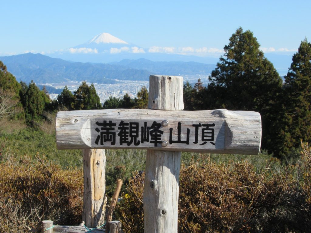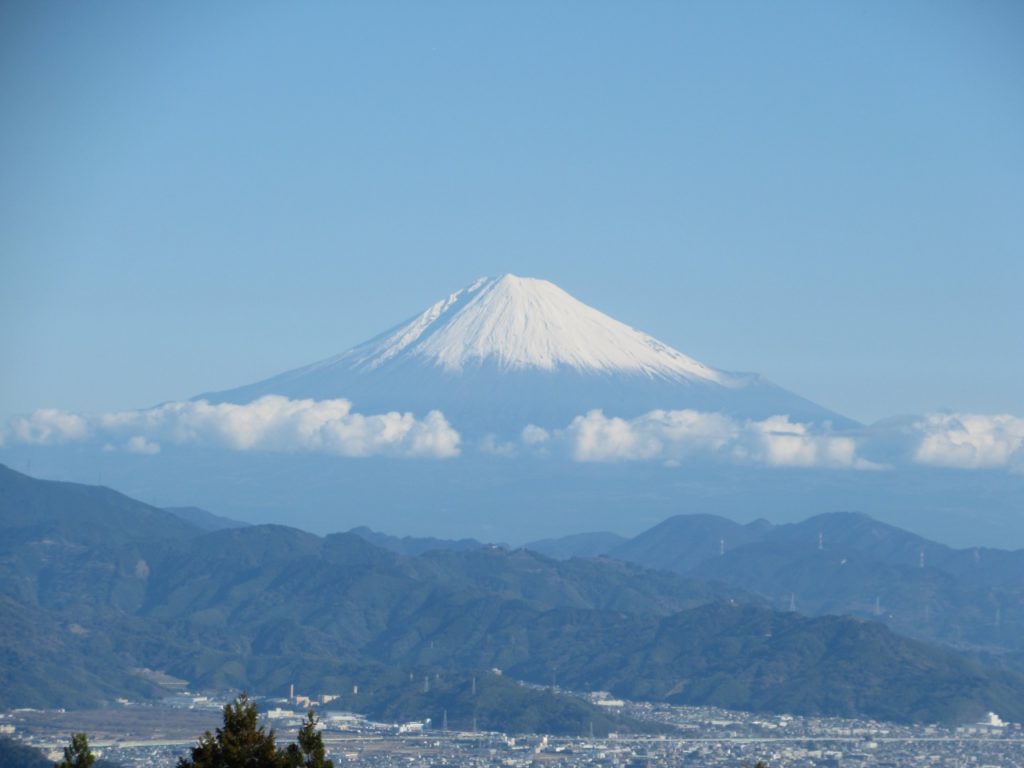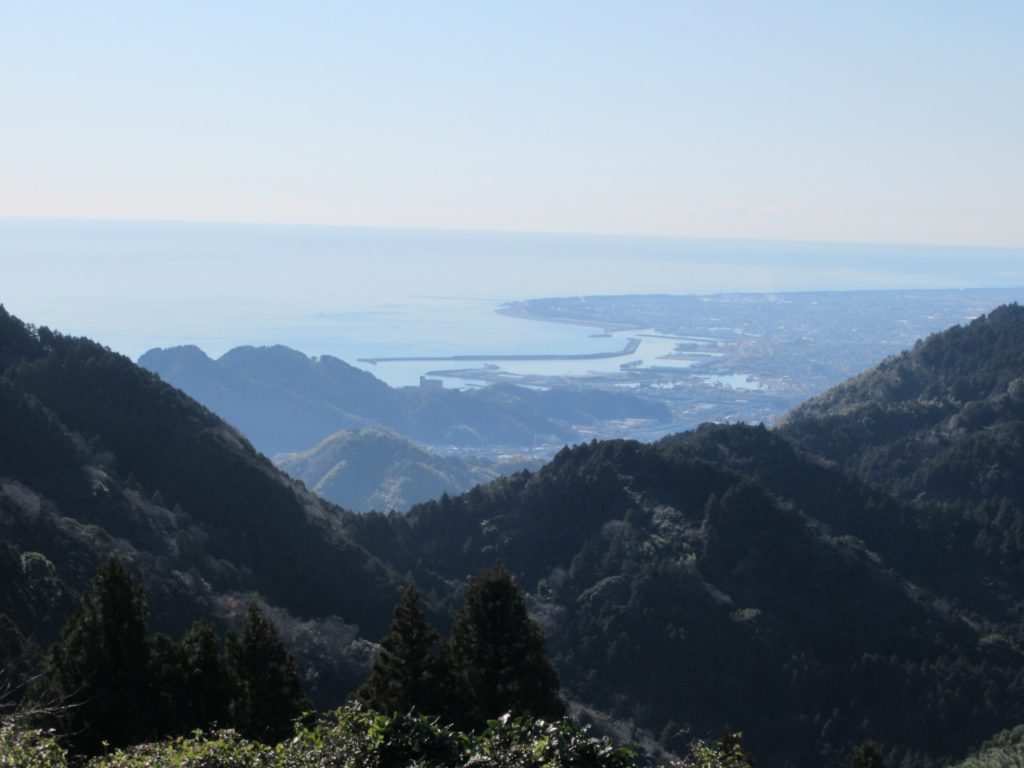 登山口から集落を離れて急登、昔収穫したみかんを運んだであろうレールの残骸があちらこちらに残され、中腹まで来ると眼下に駿河湾、近くの焼津港が見えて来ました。駐車場から2時間弱で満観峰山頂に到着、伐採された山頂は広場の様で、穏やかな好天の下、北東方向には静岡市街地と身延山地越しに大きく富士、真っ白になった南アルプス、駿河湾越しに伊豆半島、箱根の山並が見渡せました。満車になっていた駐車場もこの景色のためかとうなずけました。